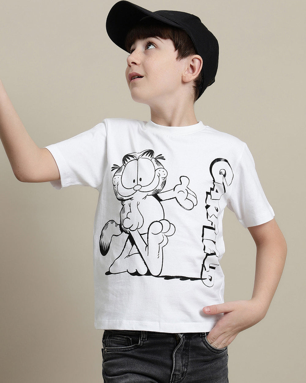 Introducing the Kidsville Garfield Printed Regular Fit Tshirt For Boys! Stay cool and comfortable this summer with this stylish and officially licensed tshirt. Made with high quality cotton material, this tshirt features a printed Garfield character on the front that is professionally printed to ensure long-lasting color. Perfect for all the GARFIELD fans out there, this tshirt will give you a trendy look and a comfortable feel. Don't miss out on this must-have addition to your wardrobe. Get your Kidsville Garfield Printed Regular Fit Tshirt For Boys today!