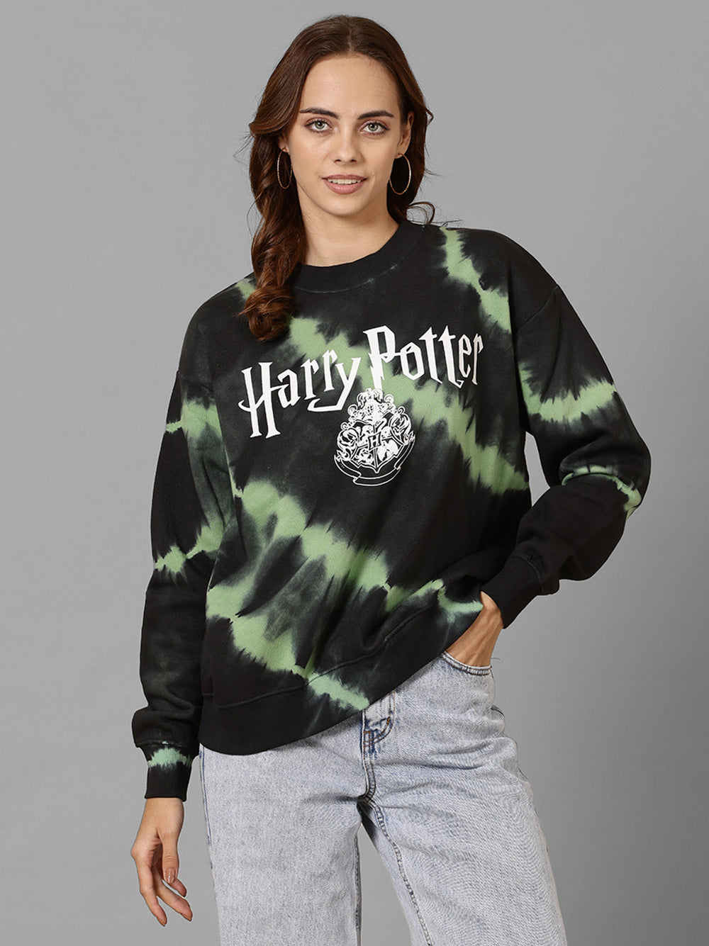Introducing the must-have item for all Harry Potter fans - the Harry Potter Slytherin Theme Oversized Sweatshirt for Women. This cozy black sweatshirt features eye-catching graphics inspired by the beloved series, making it the perfect addition to any fan's wardrobe.