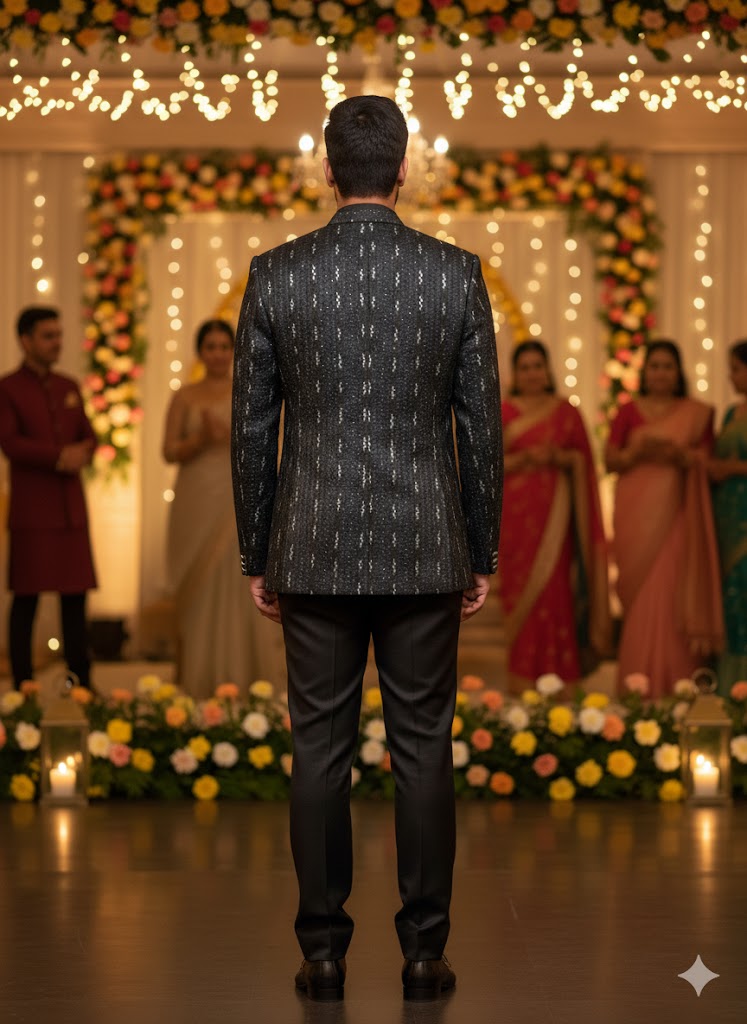 Make a bold and sophisticated style statement with this exquisite 3-piece Indo-Western ensemble. Crafted from premium jacquard fabric, this set combines traditional elegance with a modern edge perfect for weddings, receptions, and festive occasions.