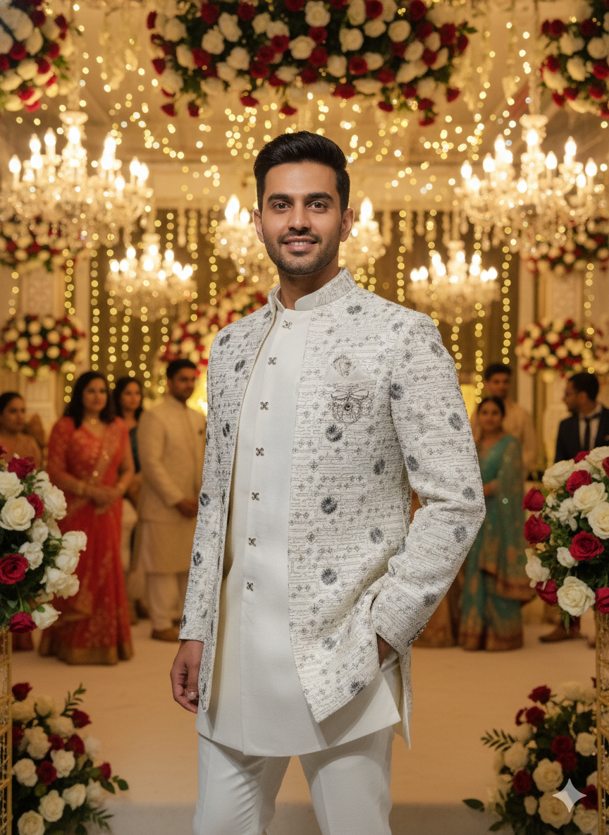 Premium Textured Fabric: The suit is crafted from a high-quality fabric that features a subtle, self-woven texture or fine pattern, adding depth and tactile interest to the rich color.