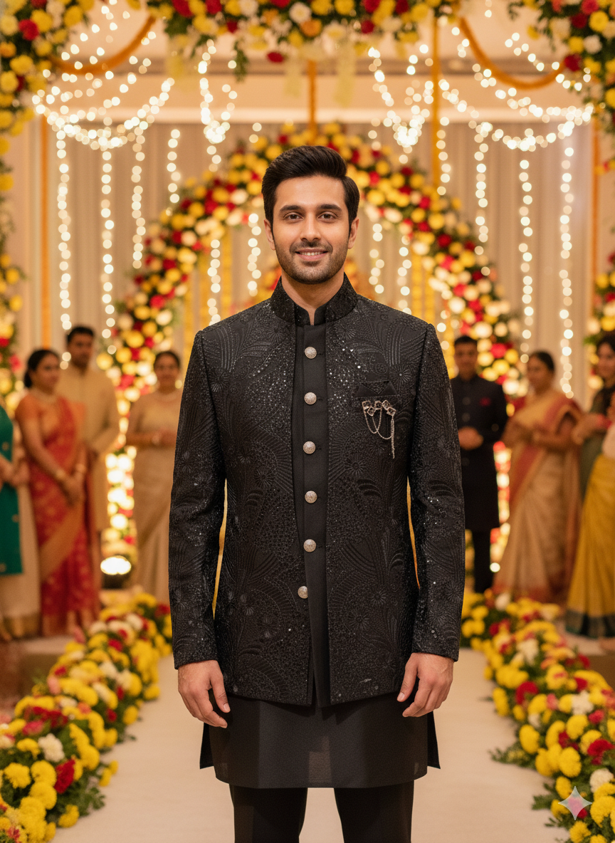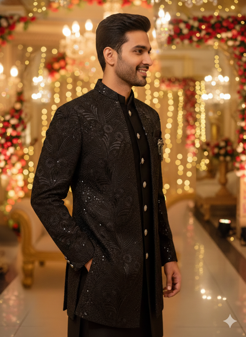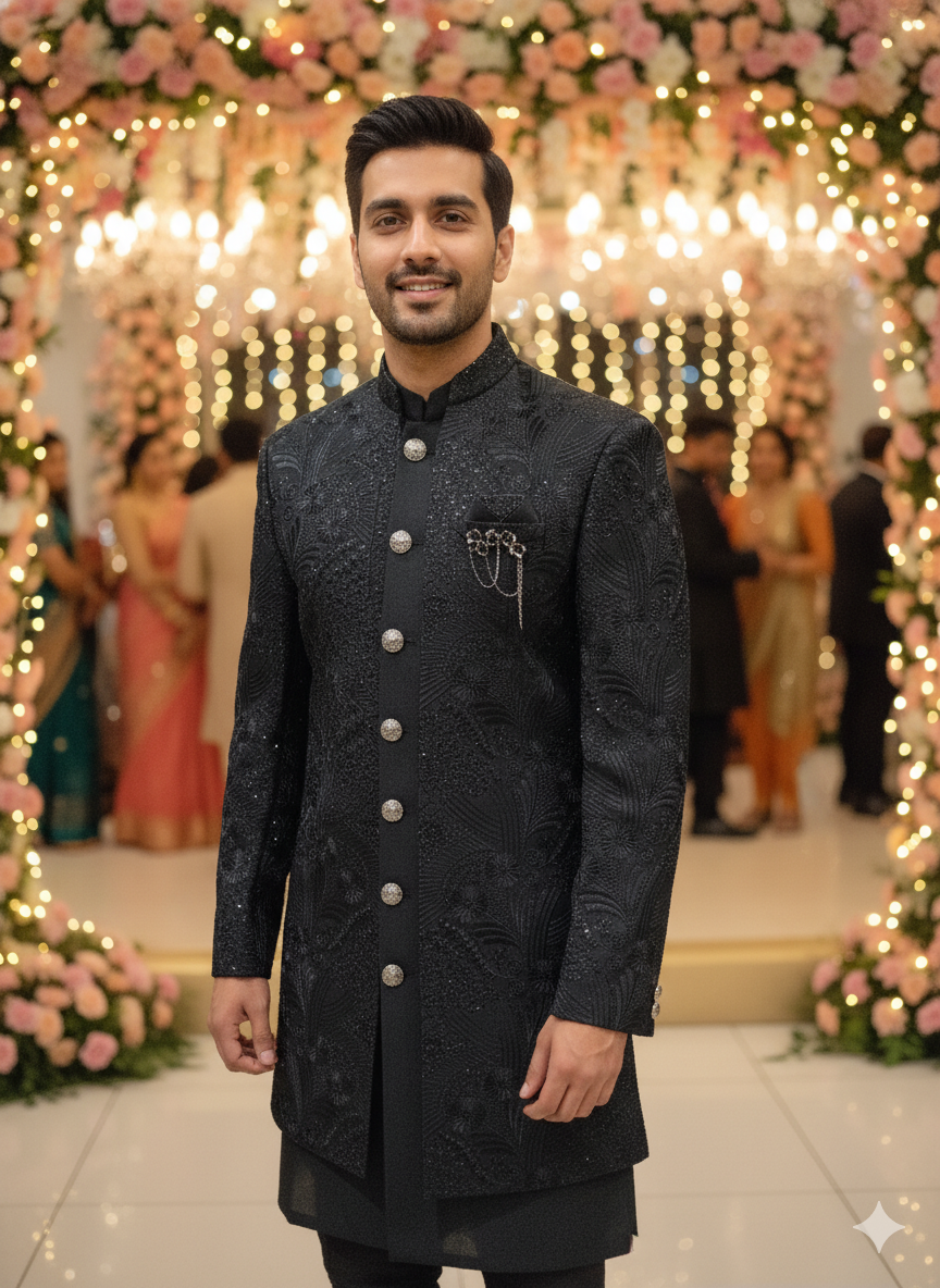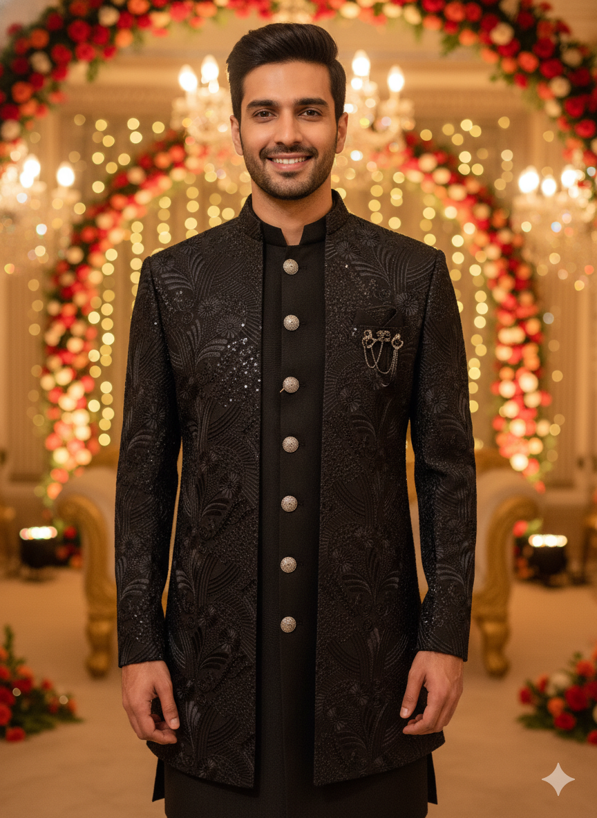 Discover the pinnacle of Indian craftsmanship with this artisan-crafted black Sherwani-style jacket. Every inch is adorned with meticulously detailed embroidery, creating a rich visual and tactile experience. The intricate patterns, combined with the understated elegance of the metallic buttons and the contemporary chained lapel pin, strike a perfect balance between tradition and modern sophistication. This ensemble is more than just clothing; it's a statement of refined taste and confident style, beautifully presented in a warm, festive ambiance.
