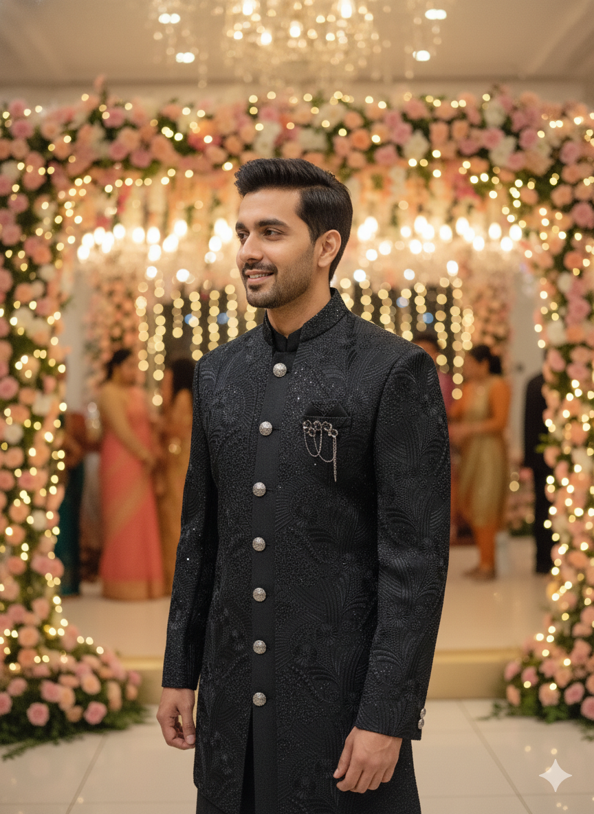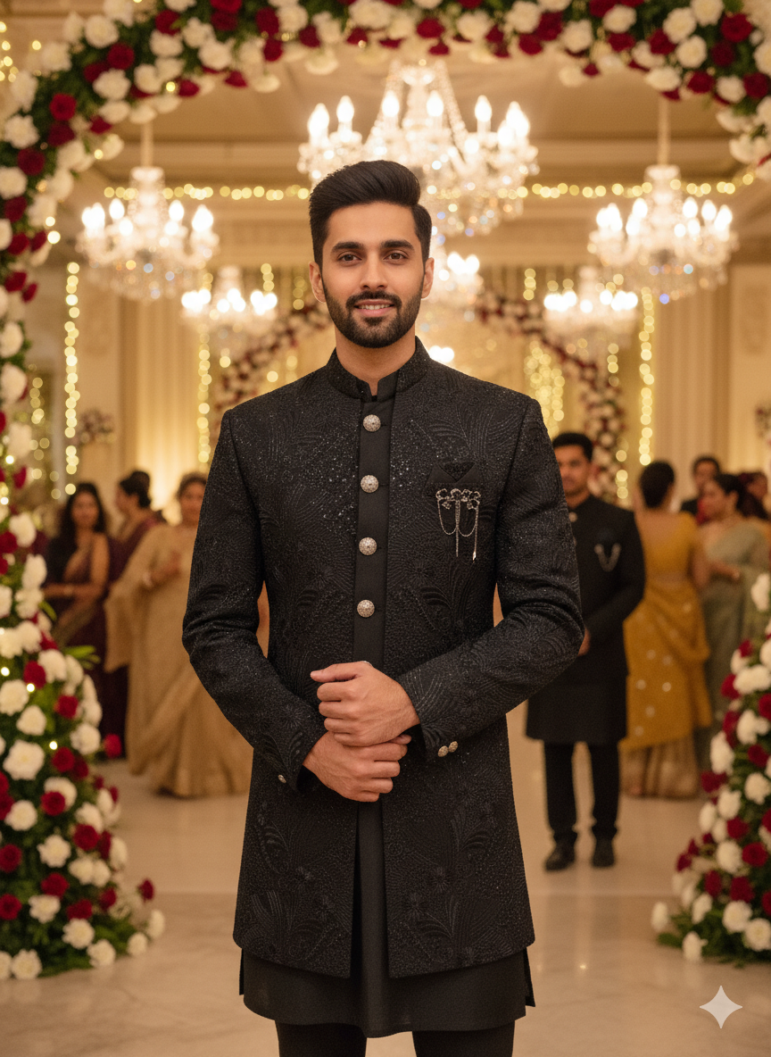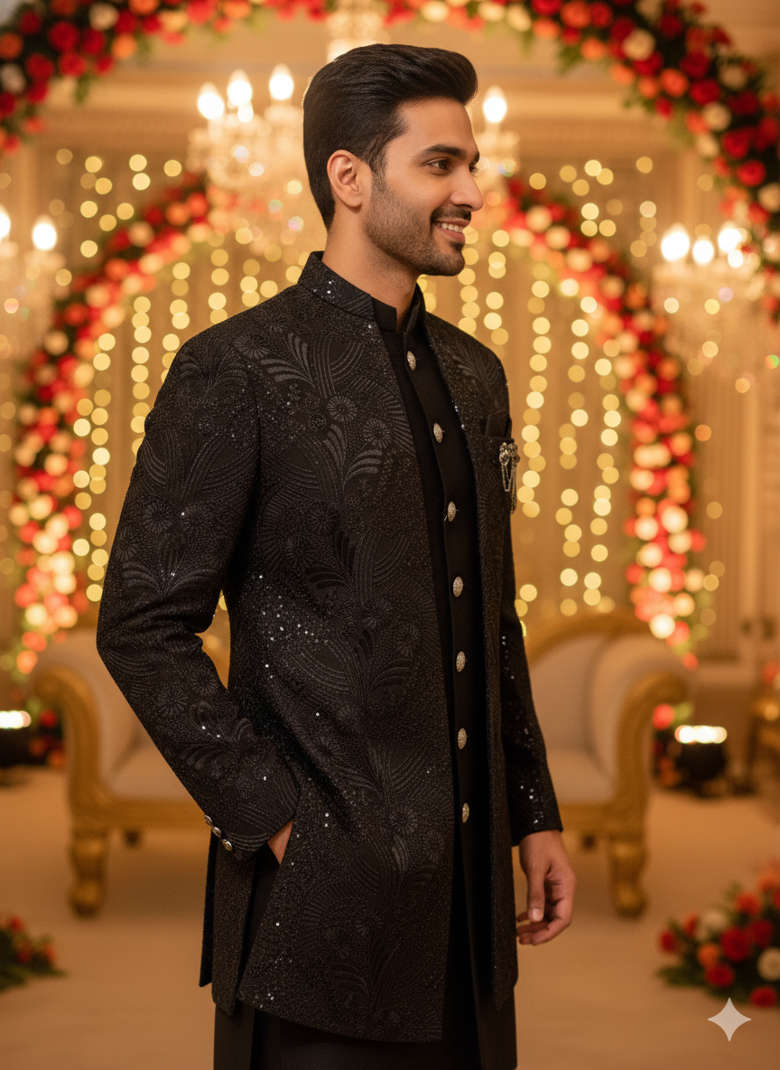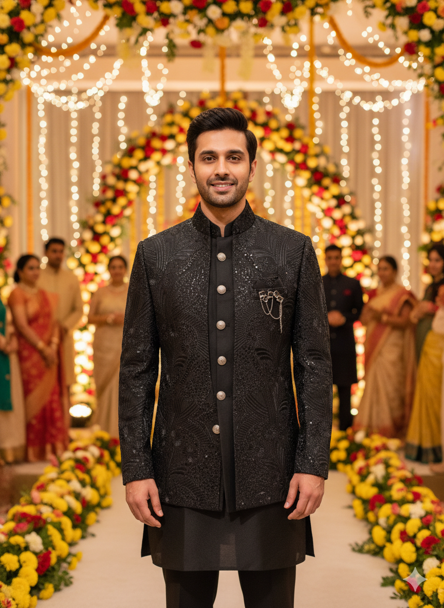 Discover the pinnacle of Indian craftsmanship with this artisan-crafted black Sherwani-style jacket. Every inch is adorned with meticulously detailed embroidery, creating a rich visual and tactile experience. The intricate patterns, combined with the understated elegance of the metallic buttons and the contemporary chained lapel pin, strike a perfect balance between tradition and modern sophistication. This ensemble is more than just clothing; it's a statement of refined taste and confident style, beautifully presented in a warm, festive ambiance.
