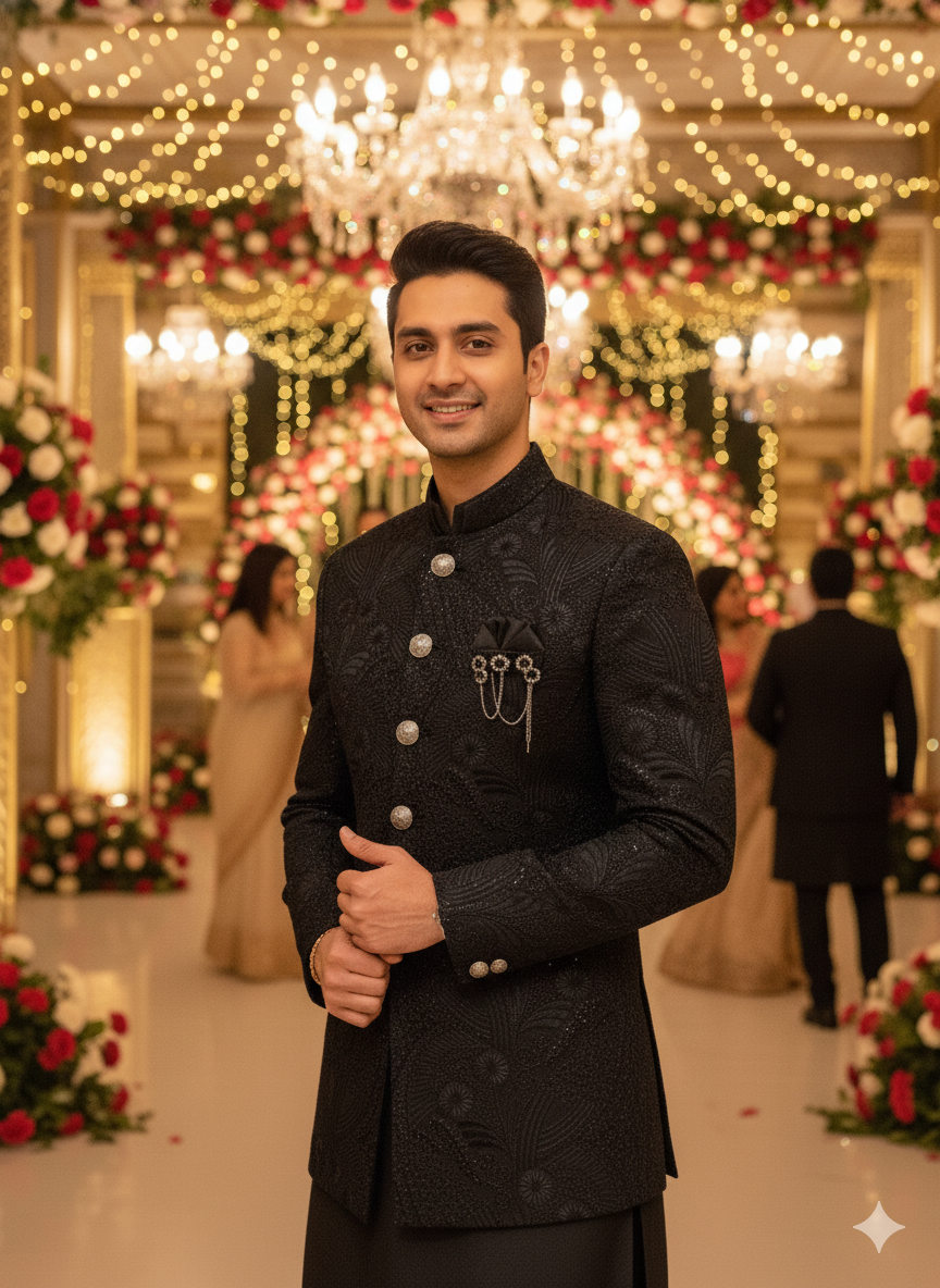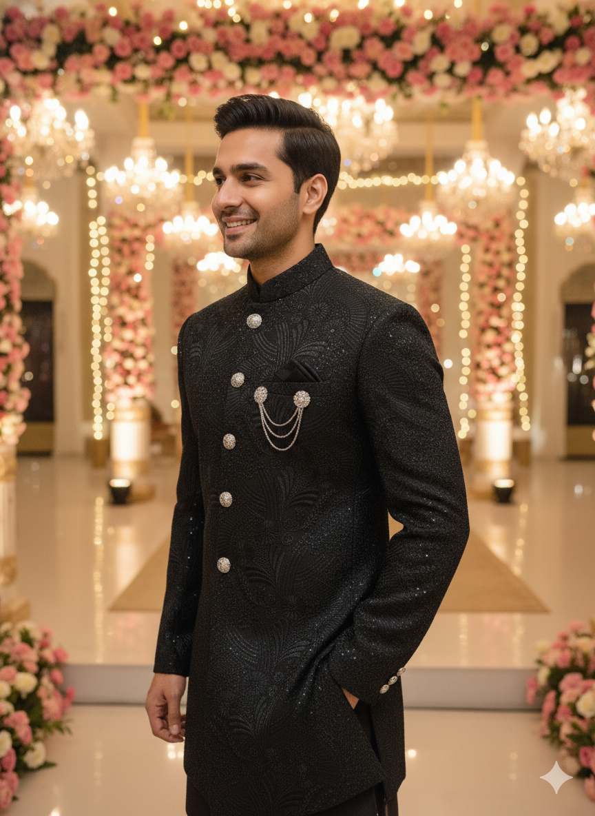 Step into the spotlight with unparalleled grace in this magnificent black Bandhgala ensemble. The jacket is a tapestry of intricate tone-on-tone embroidery, featuring delicate floral and paisley patterns that catch the light with a subtle shimmer. Complementing this rich texture are the elegant metallic buttons and the sophisticated chained brooch, adding a touch of modern luxury. Perfectly tailored for a distinguished silhouette, this outfit is designed for the gentleman who seeks to make an unforgettable impression at grand Indian weddings, receptions, or exclusive festive celebrations.