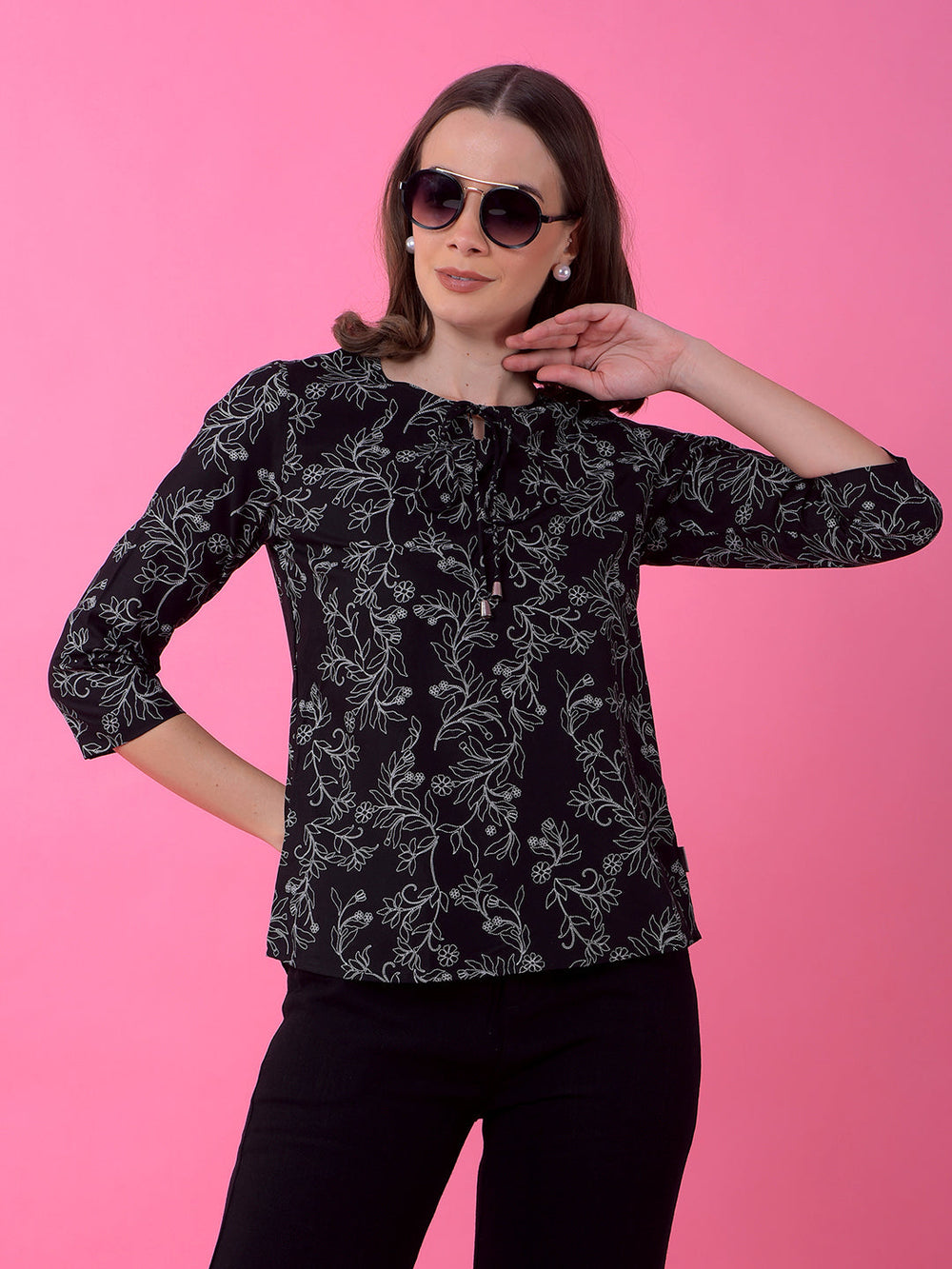 Make A Stylish Statement With The Crimsoune Club Women's Black Floral Print Tie-Up Top. This Chic Black Top Features Beautiful Floral Prints And A Trendy Tie-Up Detail, Offering A Modern And Playful Touch. Perfect For A Casual Day Out Or A Relaxed Evening, It Combines Contemporary Fashion With Effortless Comfort.