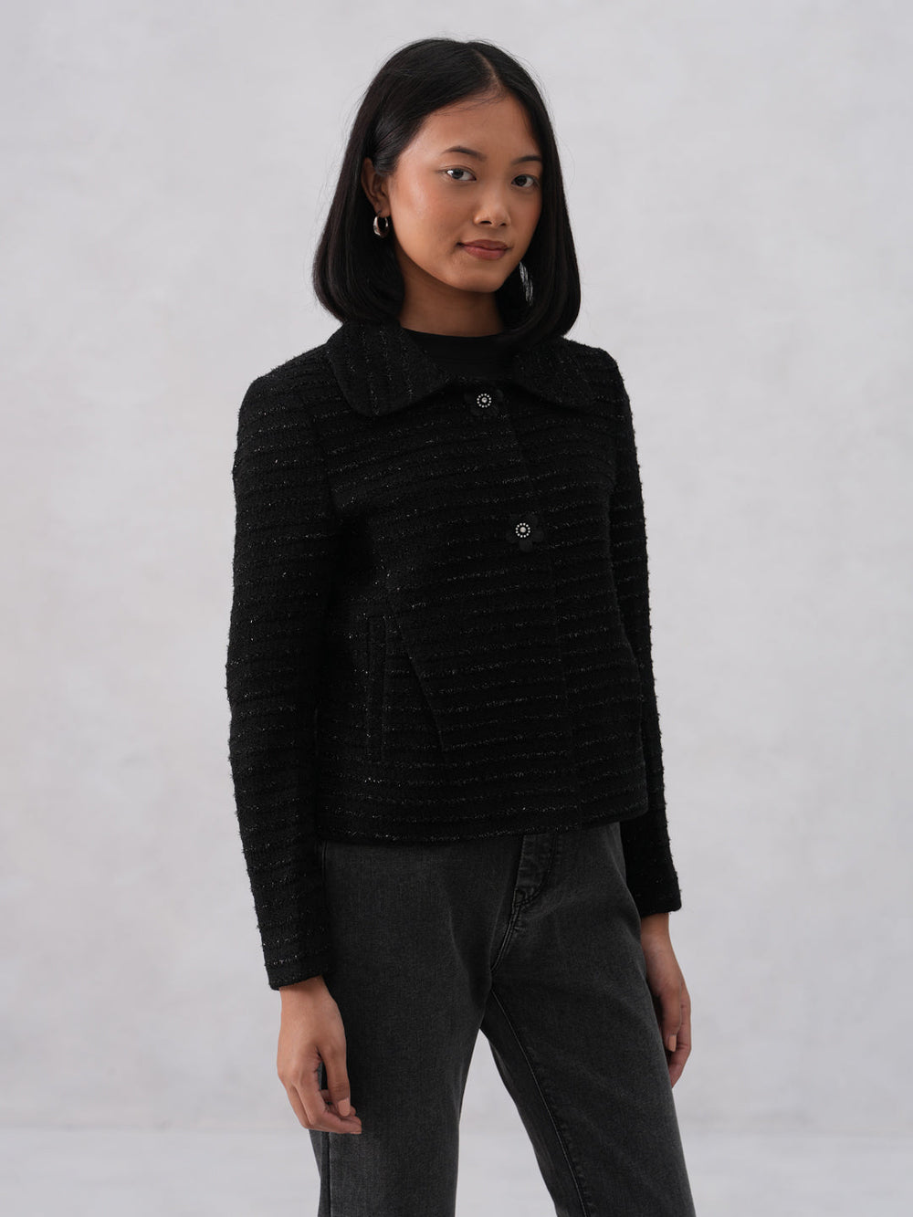 Wrap yourself in the elegance of this Crimsoune Club women's black coat. The intricate jacquard weave gives this outerwear a luxurious texture and depth, perfect for a stylish winter.