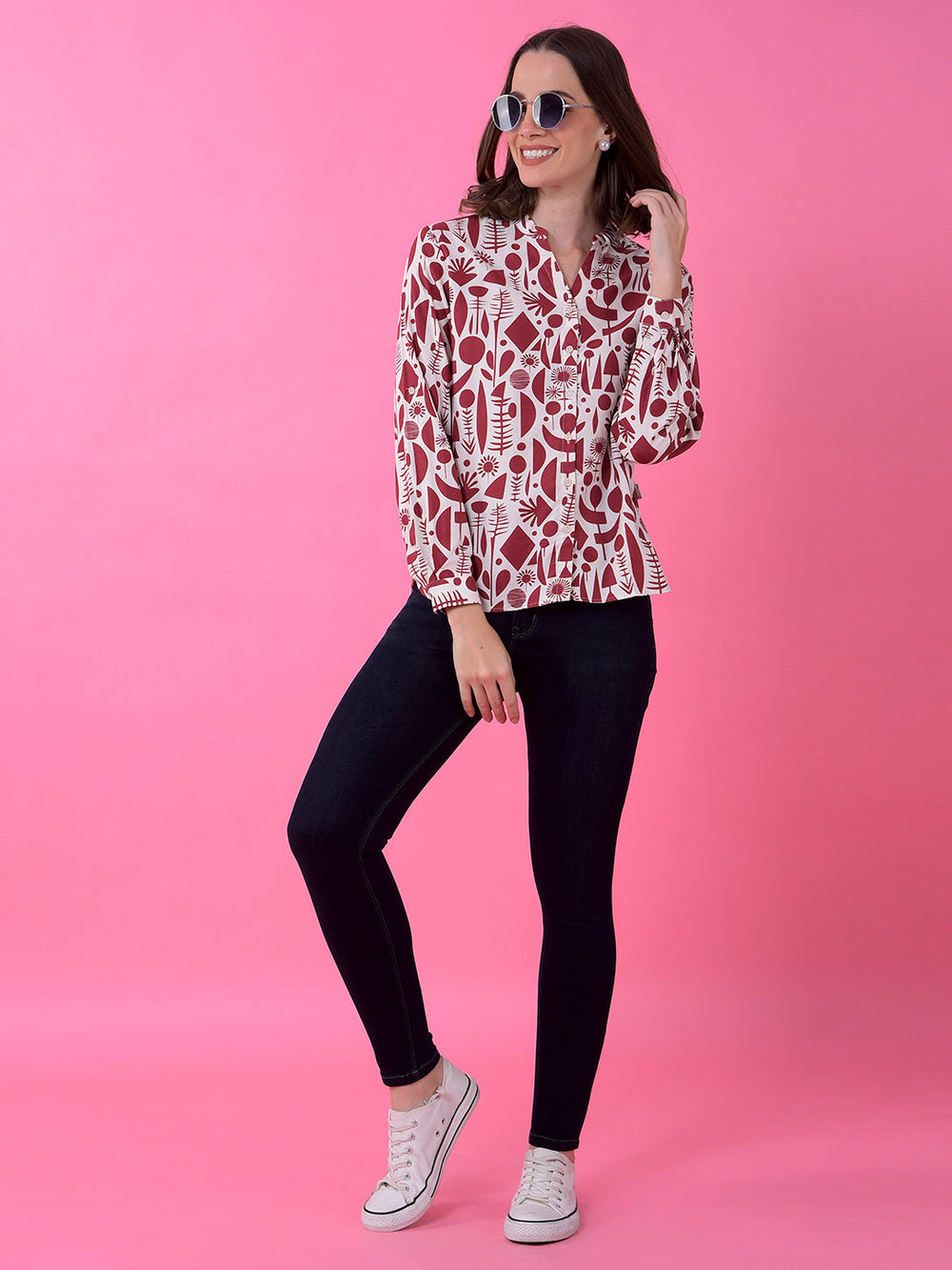 Infuse Richness Into Your Wardrobe With The Crimsoune Club Women's Maroon Printed V-Neck Shirt. This Deep Maroon Shirt Features Subtle Yet Captivating Prints And A Flattering V-Neckline, Offering A Sophisticated And Artistic Appeal. Perfect For Adding Depth And Style To Your Casual Or Semi-Formal Outfits.