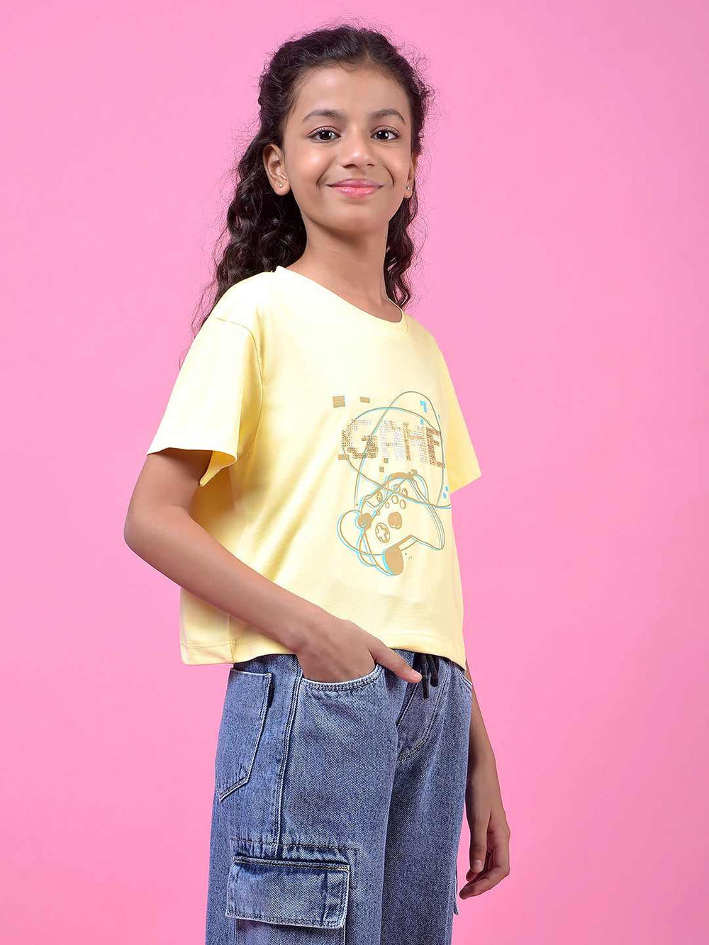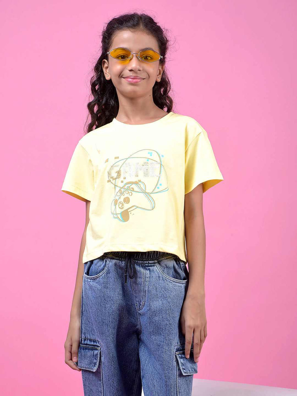 Brighten her day with the Crimsoune Club Girl's Yellow Graphic Print T-Shirt. This cheerful yellow t-shirt features a lively graphic print, providing a comfortable and stylish option for her everyday adventures.