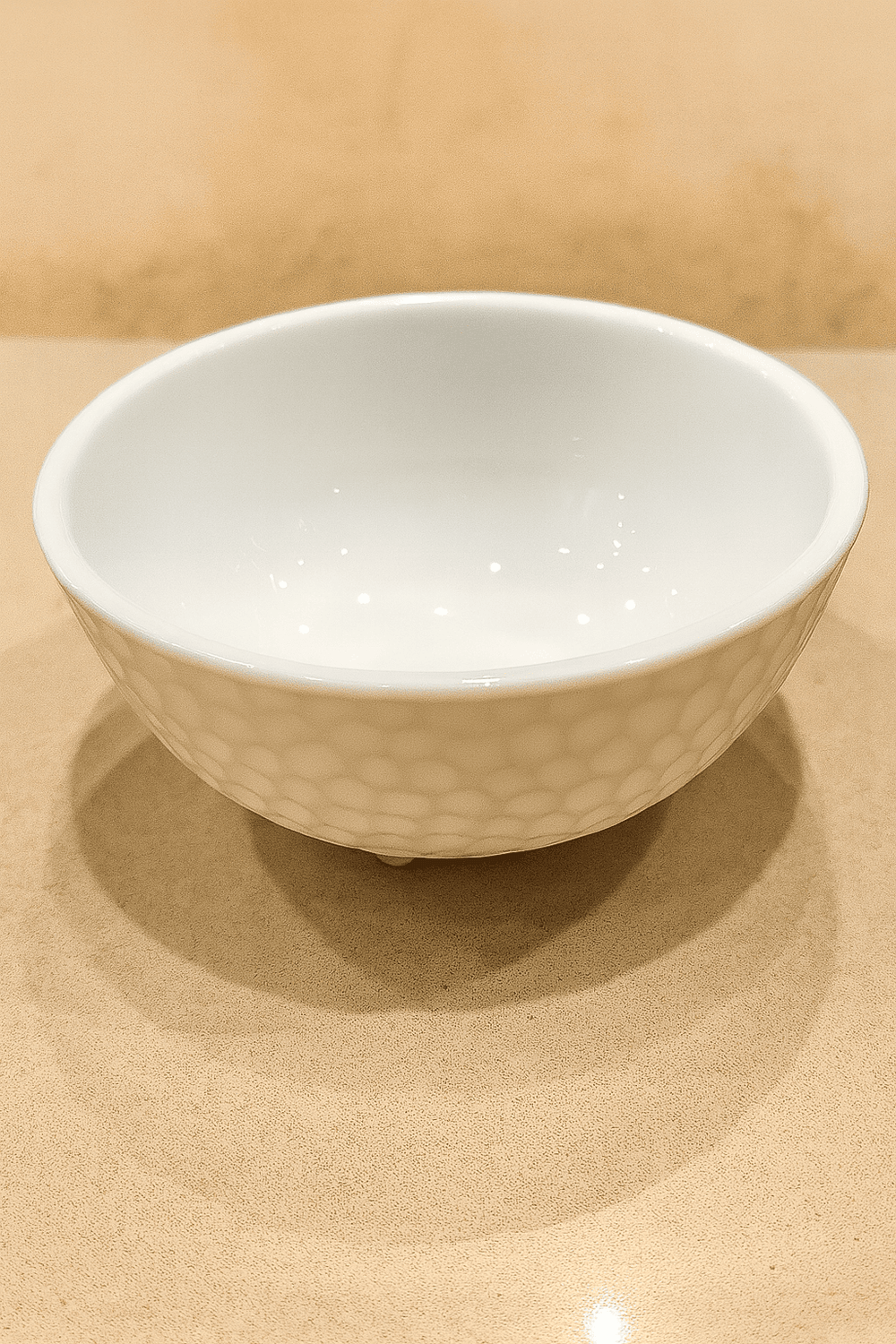 This is a white ceramic bowl with a subtle textured design, ideal for dining or serving purposes.