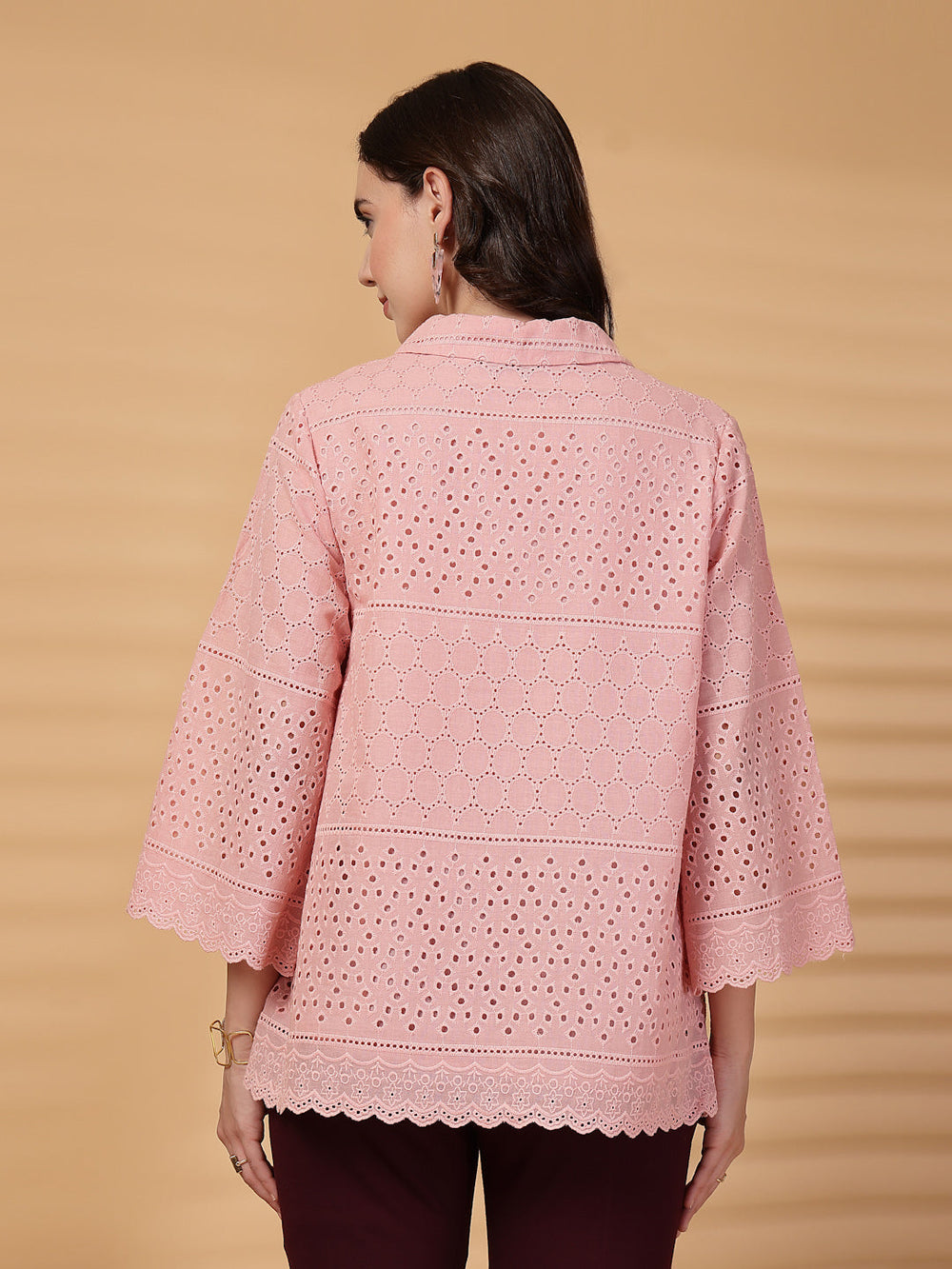 Discover effortless style with the Gipsy schiffli tunic. Crafted from soft, breathable cotton schiffli fabric, this tunic showcases a delicate self design intricate pattern in beautiful dusky pink color, adding a touch of sophistication to your wardrobe. The flattering collar and three-quarter sleeves offer a timeless, polished look, making it perfect for casual occasions. Whether paired with jeans or skirts, this versatile tunic by Gipsy ensures comfort, style, and elegance in one chic piece.