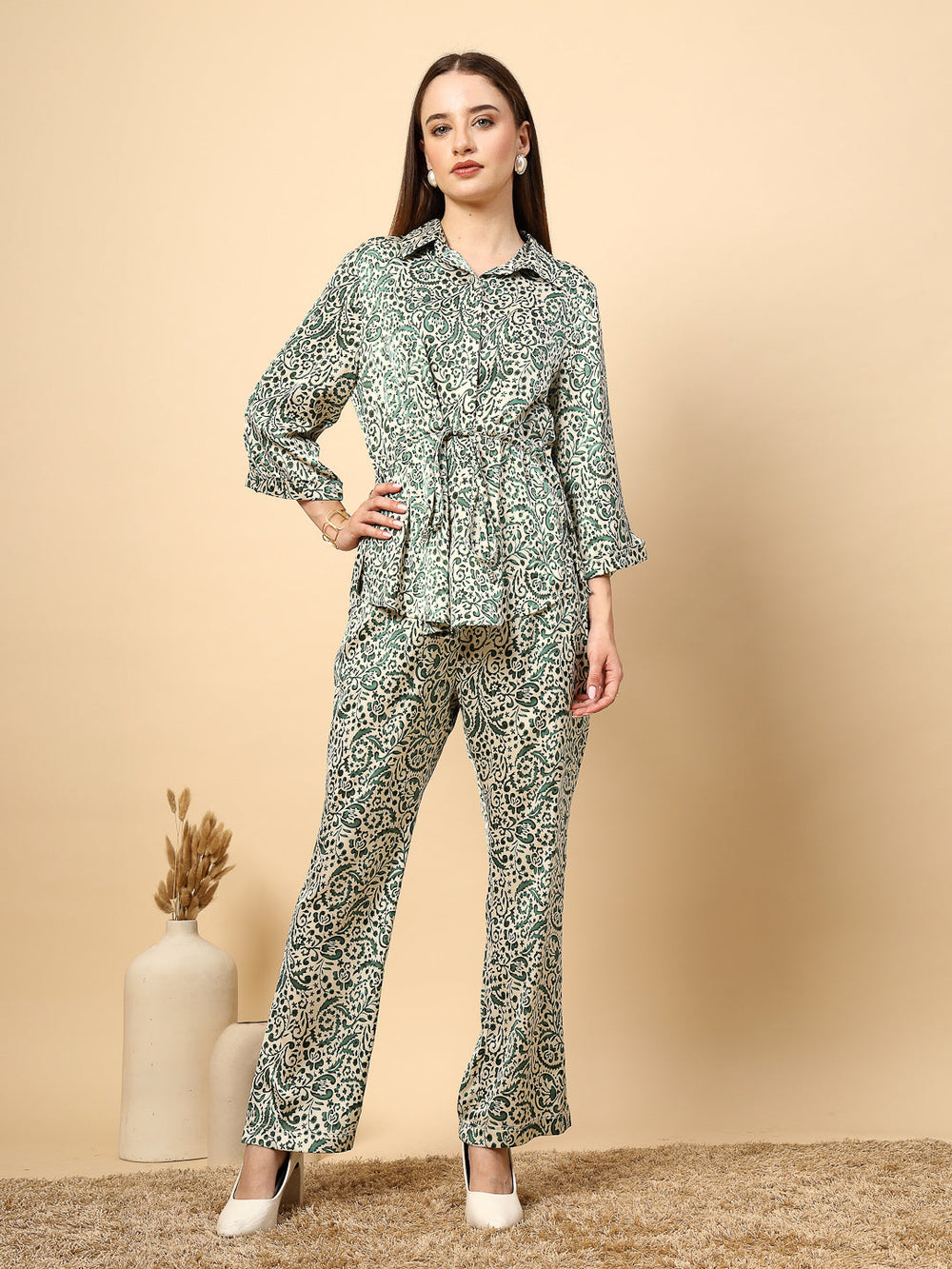 The Gipsy Woman Green Polyester Co-Ord Set offers a chic design with printed fabric, polyester shine buttons, and front knotting. This set ensures a fashionable yet comfortable outfit for any occasion.