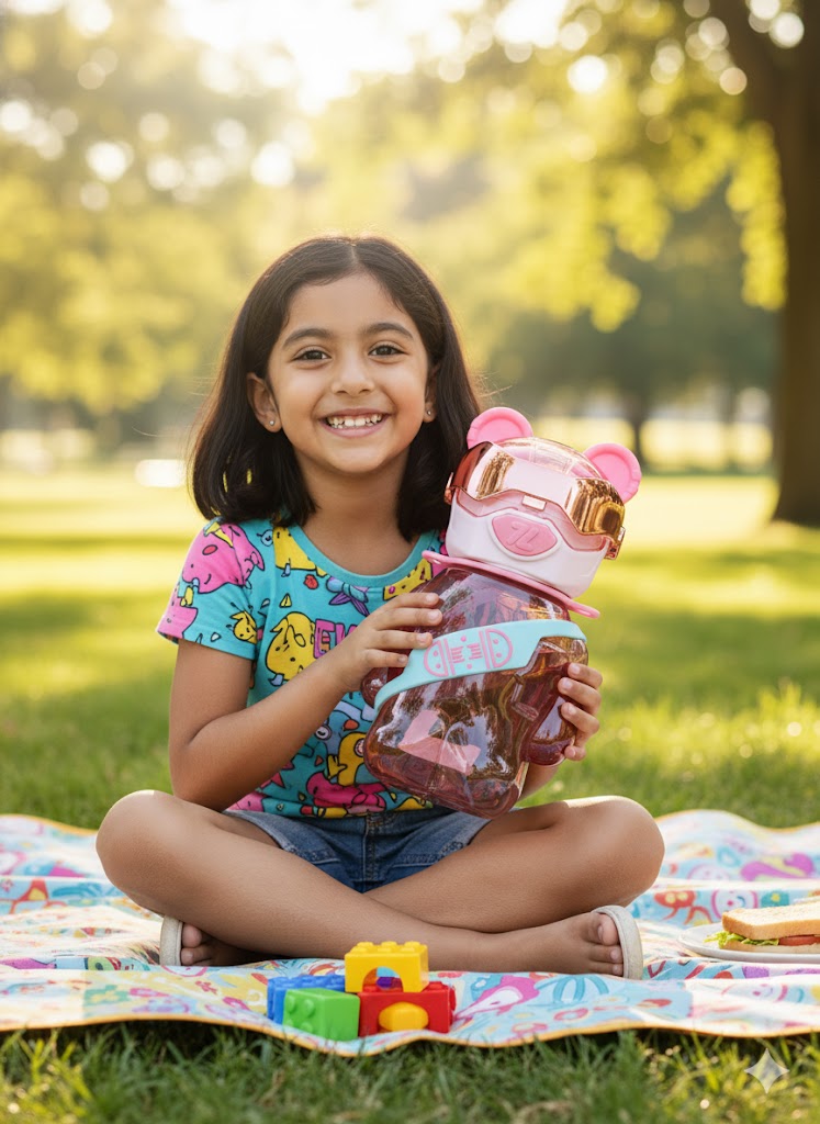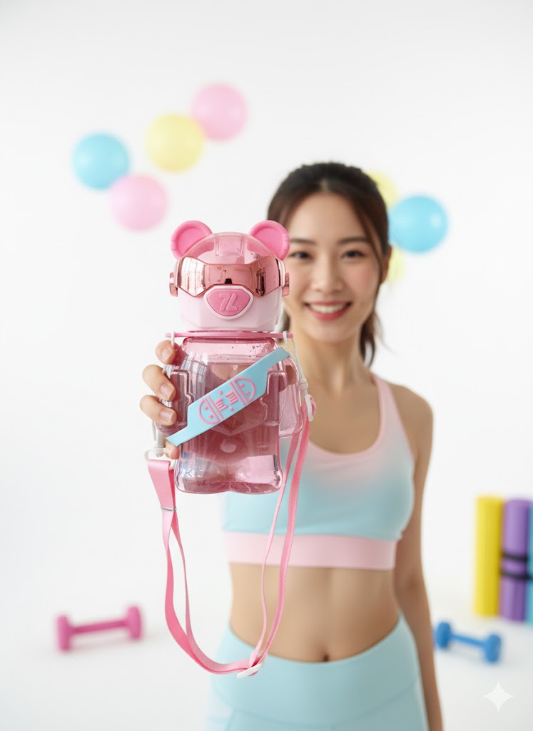 Adorable astronaut bear-shaped water bottle designed for kids! This fun and stylish bottle features a glossy bear design with cute ears and a futuristic visor-style lid. It includes a soft silicone straw for easy sipping and a detachable pink strap for convenient carrying. Made from BPA-free, durable plastic, it’s perfect for school, travel, or outdoor adventures. The bear’s chest band adds a playful touch, making hydration enjoyable for little ones.