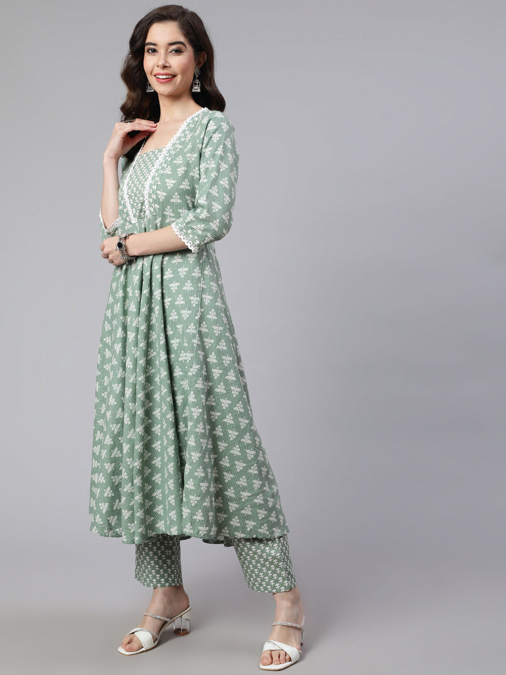 Give a refreshing twist to your ethnic closet with Jaipur Kurti. Tailored with sartorial perfection, this Green Woven Ethnic Print Embroidered Flared Laced Kurta features lace detailing all over with a glass-shaped neckline and three-quarter sleeves. Paired with a matching green printed palazzo with a slip-on closure and a partially elasticated waistband, this is a comfortable fit.