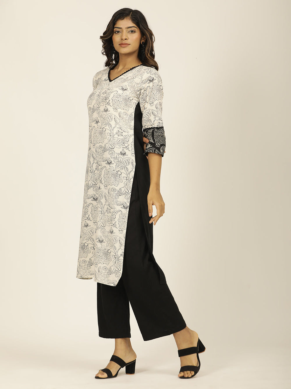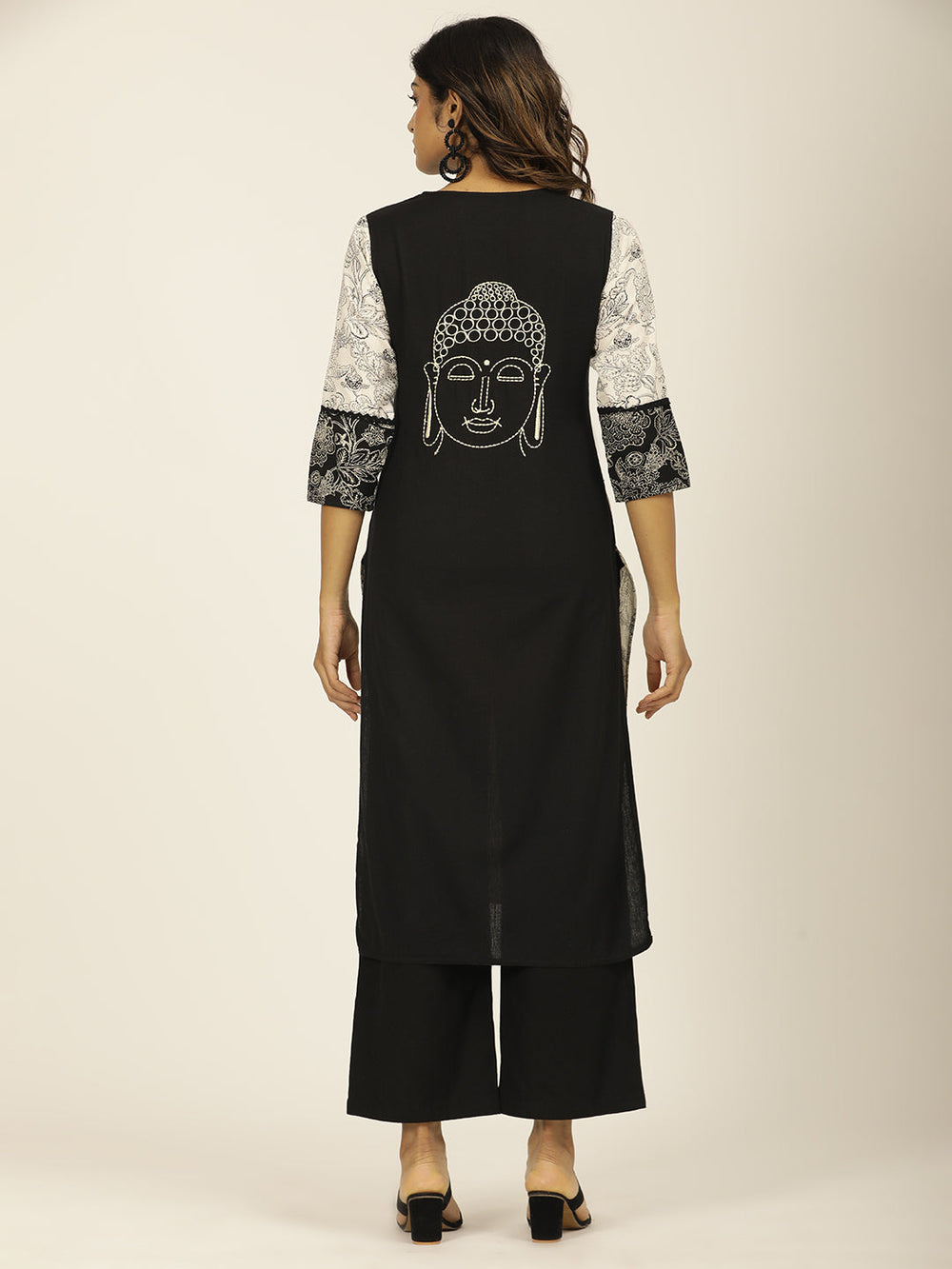 This Black Handblock Printed Kurta has a v-neckline, three-quarter sleeves, crochet lace details and threadwork. Paired with solid black pants with a partially elasticated waistband.