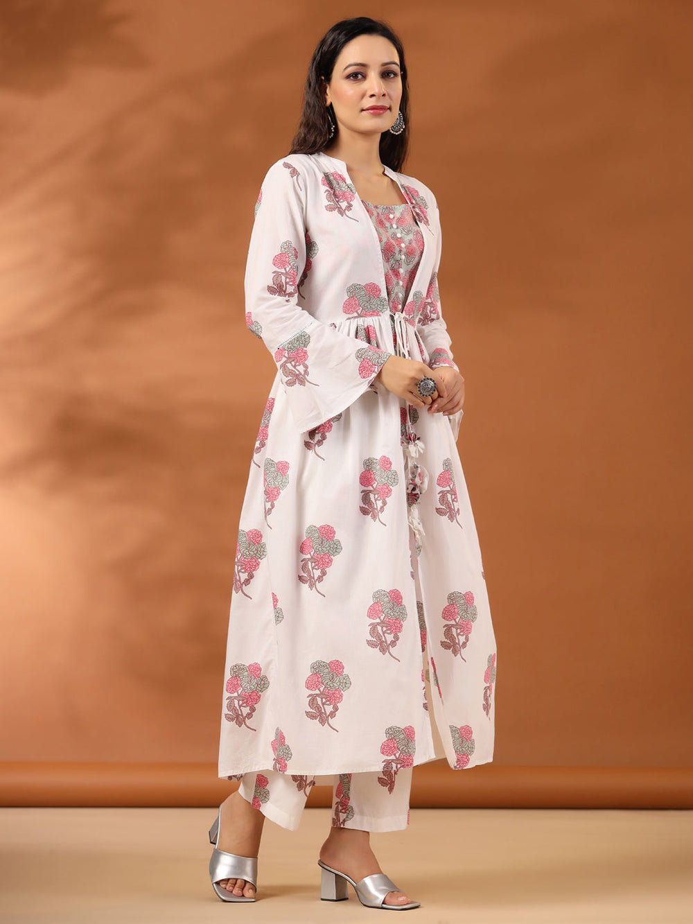 Presenting A Flowy-Floral Bliss. This Green Floral Printed Cotton 3-Piece Co-Ord Set Comes With A Crop Top, Pants And A Shrug. The Green Floral Printed Top Has A Round Neckline, Is Sleeveless And Has White Potli Show Buttons. The Shrug Has Bell Sleeves, Pleated Gatherings And A Front Drawstring With Tassels. Paired With Regular Printed Partially Elasticated Pants