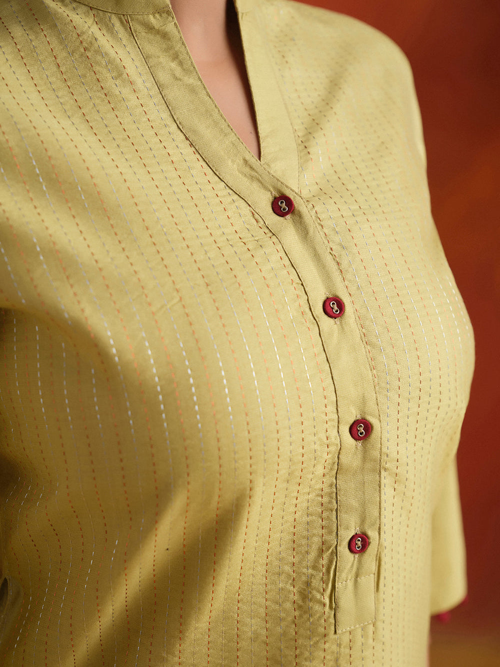 A classic style, this Chanderi Kantha Embroidered Straight Kurta has traditional charm. It has a mandarin collar, front button details, embroidered three-quarter flared sleeves and a straight hemline.