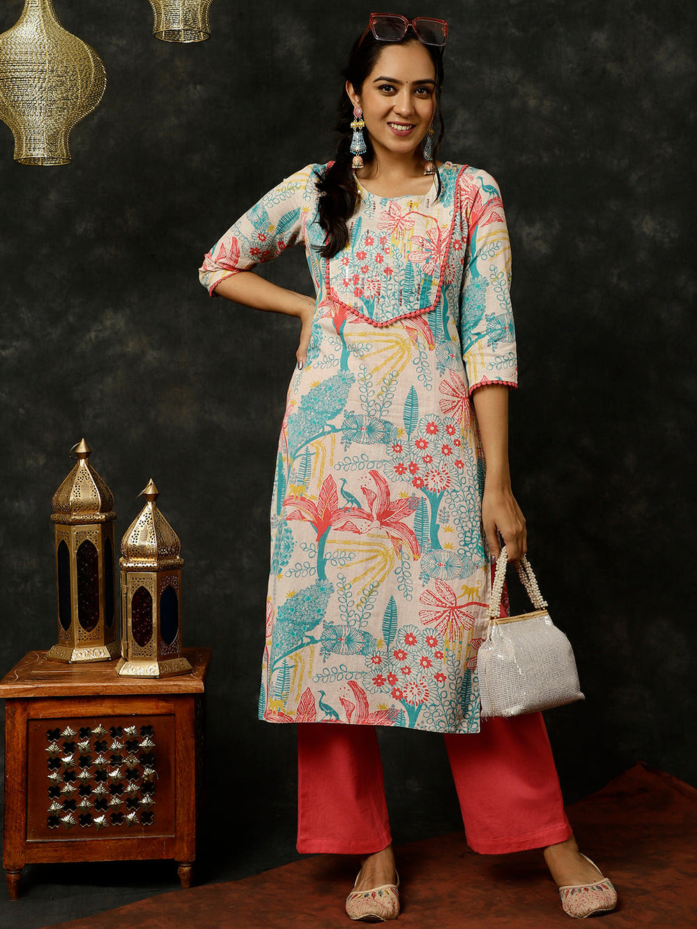 Add a refreshing touch to your wardrobe with this Coral Kantha Work Printed Straight Kurta With Palazzo. Made in cotton fabric, the kurta has a round neckline, kantha work with lace details, colorful tropical prints, three-quarter sleeves with lace and a straight hemline. It comes with a solid coral palazzo which has a partially elasticated waistband and side pockets.