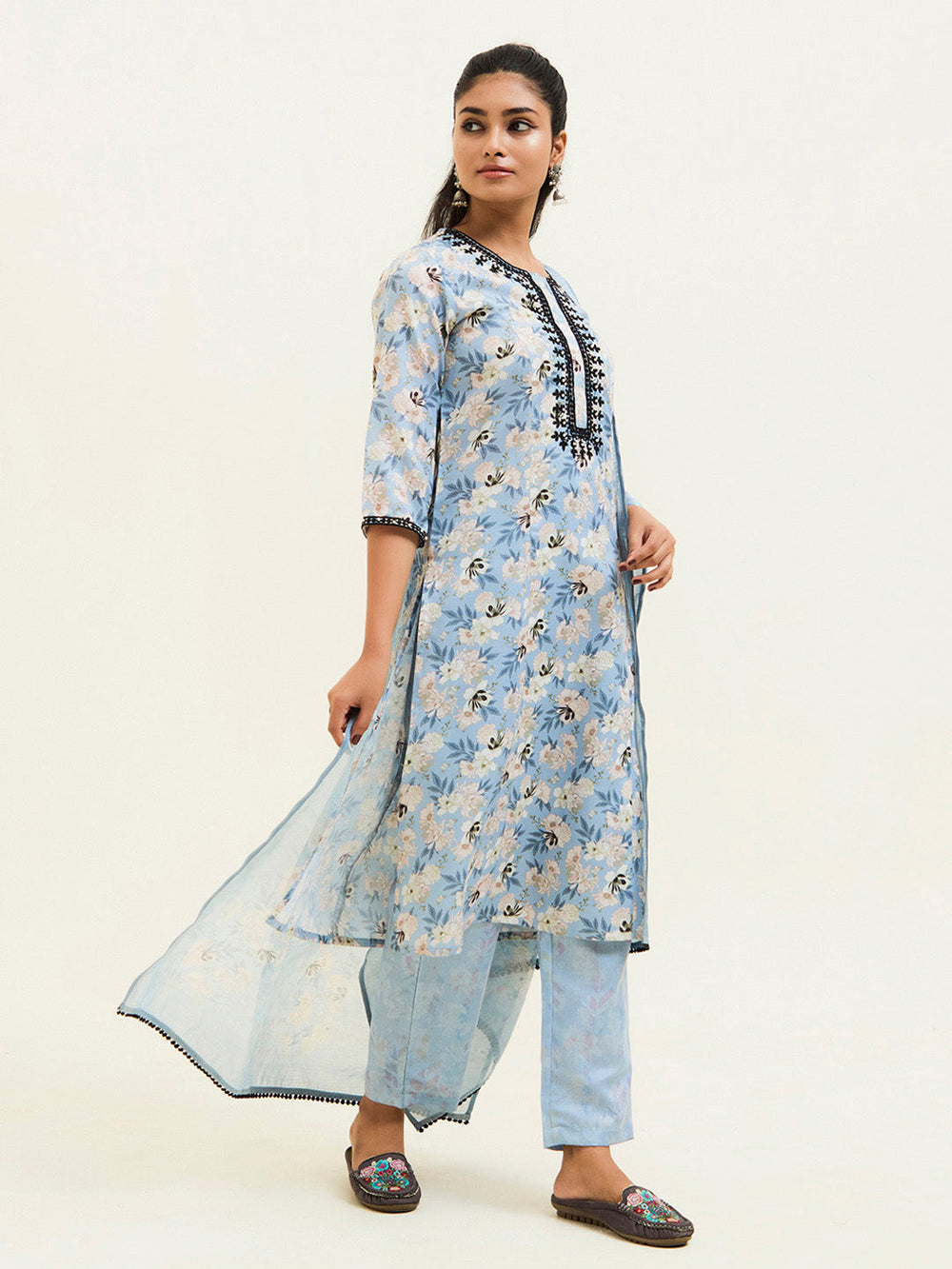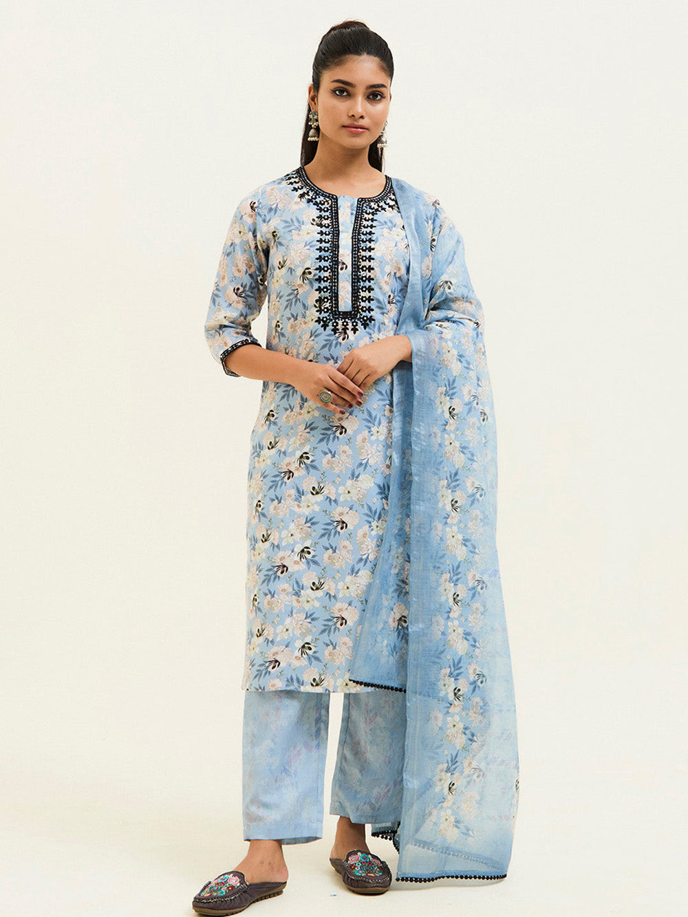 Refresh your wardrobe with this Floral Printed Embroidered Suit Set. The kurta has a round neck, dori and beadwork embroidered yoke, three-quarter sleeves and a straight hemline. Paired with partially elasticated pants and floral printed dupatta with lace.