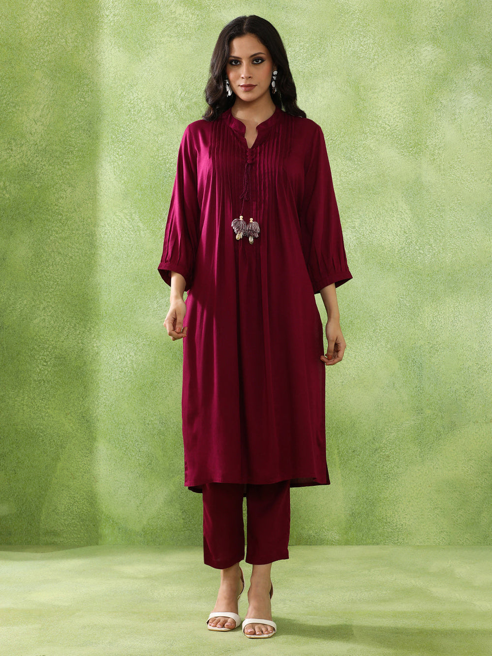 Embrace a comforting style with this Solid Embroidered Viscose Rayon Magenta Kurta Sets. This Straight Kurta For Women has a Mandarin Collar, Three-Quarter Sleeves With Beads and Stones. Paired With a Trousers.