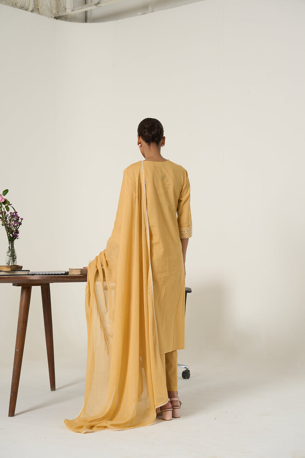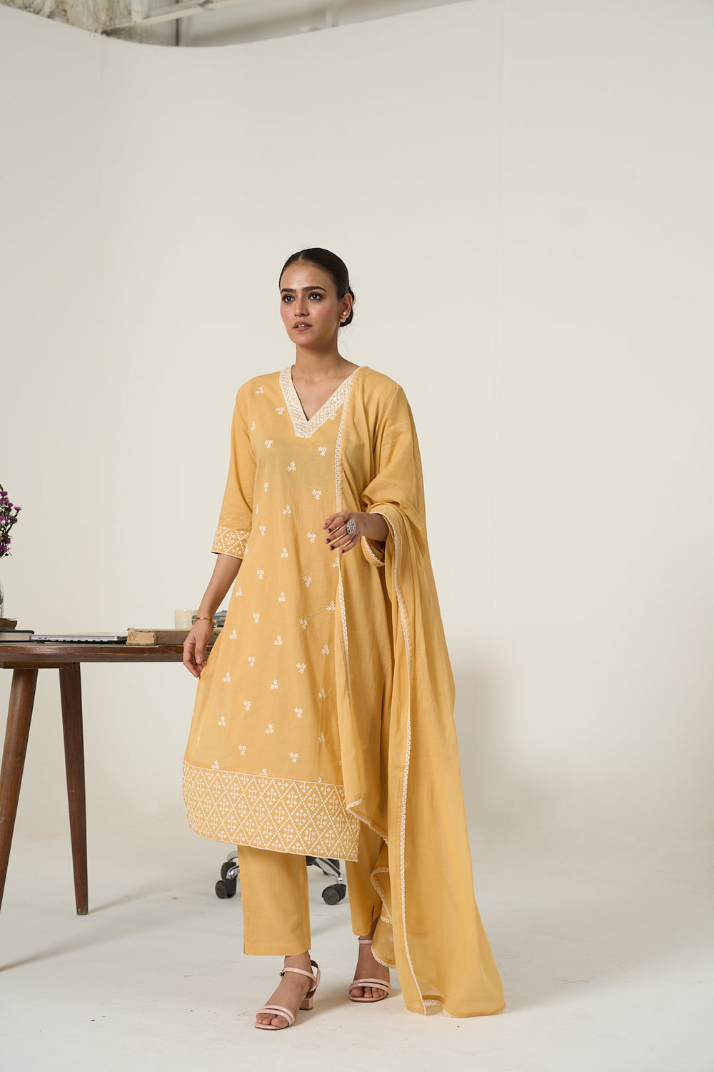 Embrace a comforting style with this Floral Embroidered Pure Cotton Beige Kurta Sets. This Straight Kurta For Women has a V-Neck, Three-Quarter Sleeves With Thread Work. Paired With a Trousers.