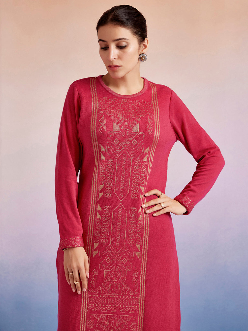 Embrace ethnicity in this Fuchsia Jacquard Straight Woolen Kurta Set. The kurta has a round neck, a side pocket and full sleeves. It is paired with matching pants.