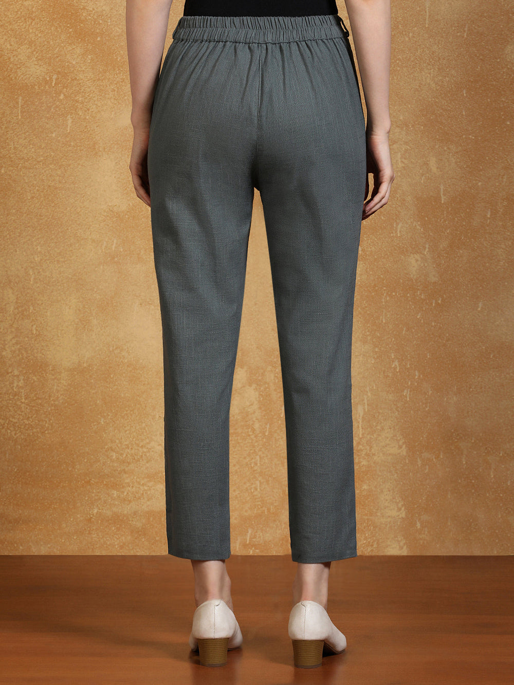 Embrace an elegant style in these Grey Solid Cotton Slub Straight Pants with front pleats, a partially elasticated waistband and both side pockets.