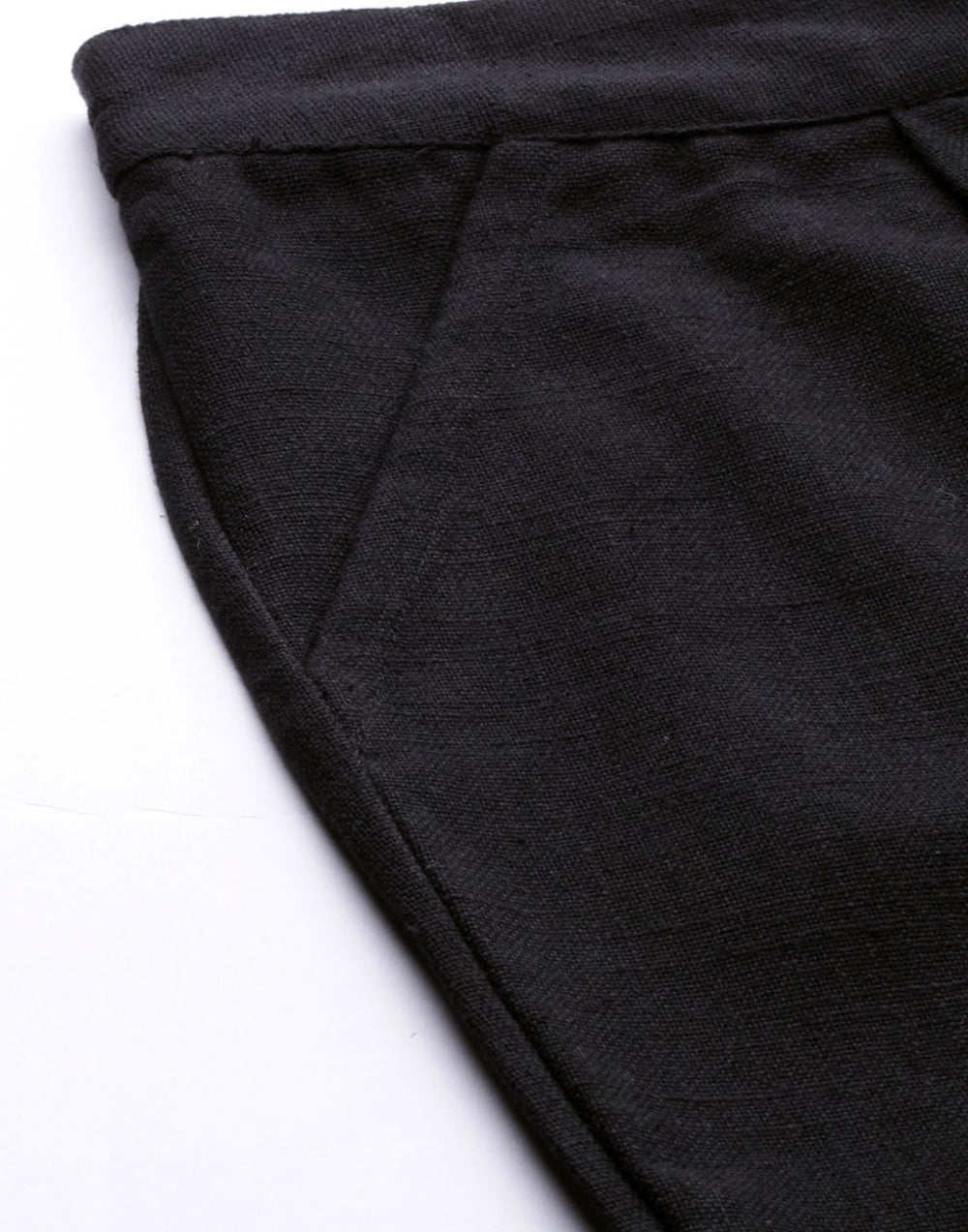 Elevate your look with these Black Cotton Slub Pants. It features front pleats, wooden button details at the hemline, both side pockets and a partially elasticated waistband.