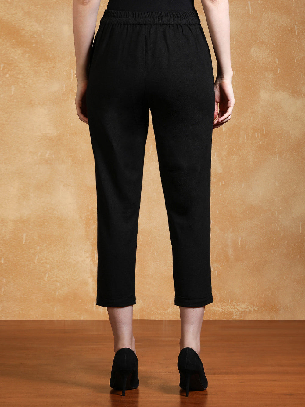Embrace an elegant style in this Black Cotton Slub Bottom-Fold Straight Pants with front pleats, a partially elasticated waistband, both side pockets and a fold pattern on the hems.