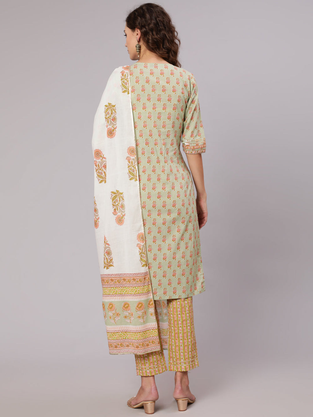 A Straight Ethnic Printed Kurta Has Printed Fabric Yoke Which Is Embellished With Gota Laces On It, Round Neck And 3/4Th Sleeves Which Has Gota Lines On Hem, Side Slit, Straight Hem, Ethnic Printed Cotton Pants Which Has Pockets And Elastic At Waist, Gota Lines At The Hemline Of Pants. Placement Printed Cotton Dupatta Which Has Gota Lines All Over The Sides.