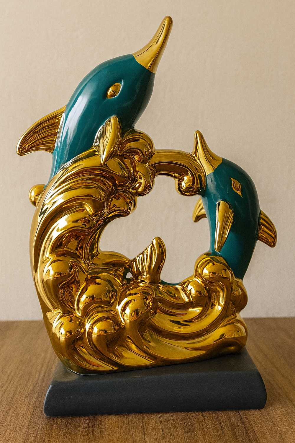 The contrast between the deep, rich teal glaze of the dolphins and the highly polished, reflective gold waves creates a sophisticated color palette that works wonderfully in both coastal and contemporary minimalist interiors. Every curve and bubble of the sculpted wave is highlighted by the brilliant metallic finish, ensuring this piece acts as a radiant focal point in your room. Mounted securely on a solid black base, this sculpture is a substantial and memorable decorative item, making it an excellent statement piece or a thoughtful gift for those who appreciate marine life and luxurious home accents.
