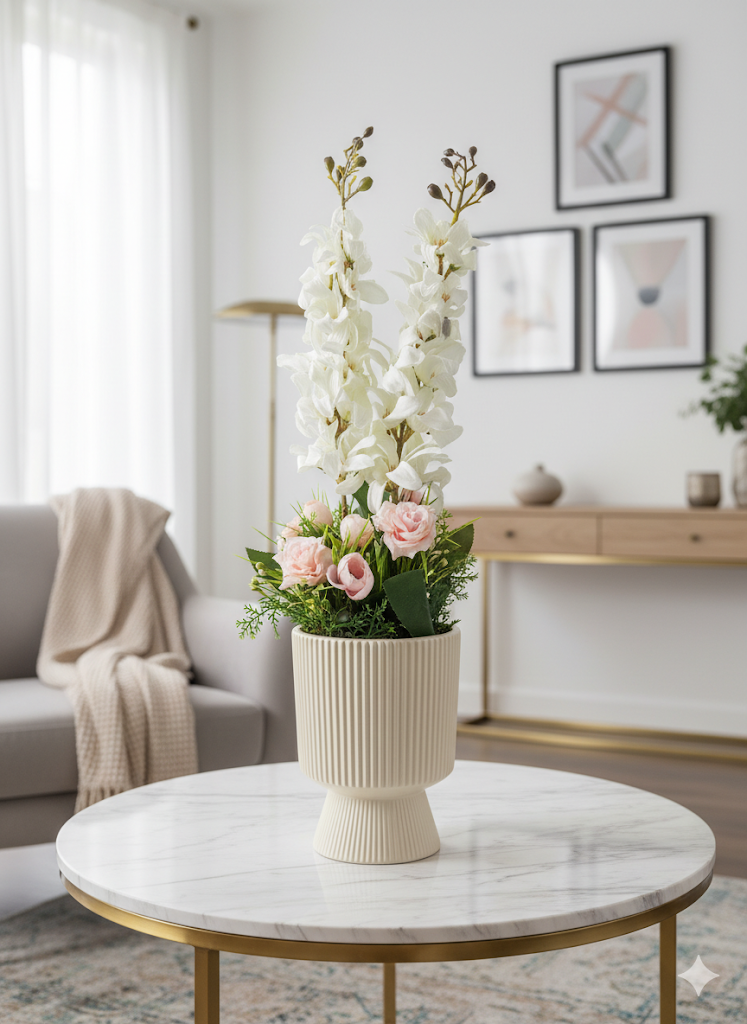 This arrangement is not just about the flowers—it's about the style. It comes secured in a modern, earthy green ceramic planter with a tactile, textured finish. This contemporary pot makes the arrangement ready to display right out of the box, fitting seamlessly into modern, bohemian, or traditional interiors.