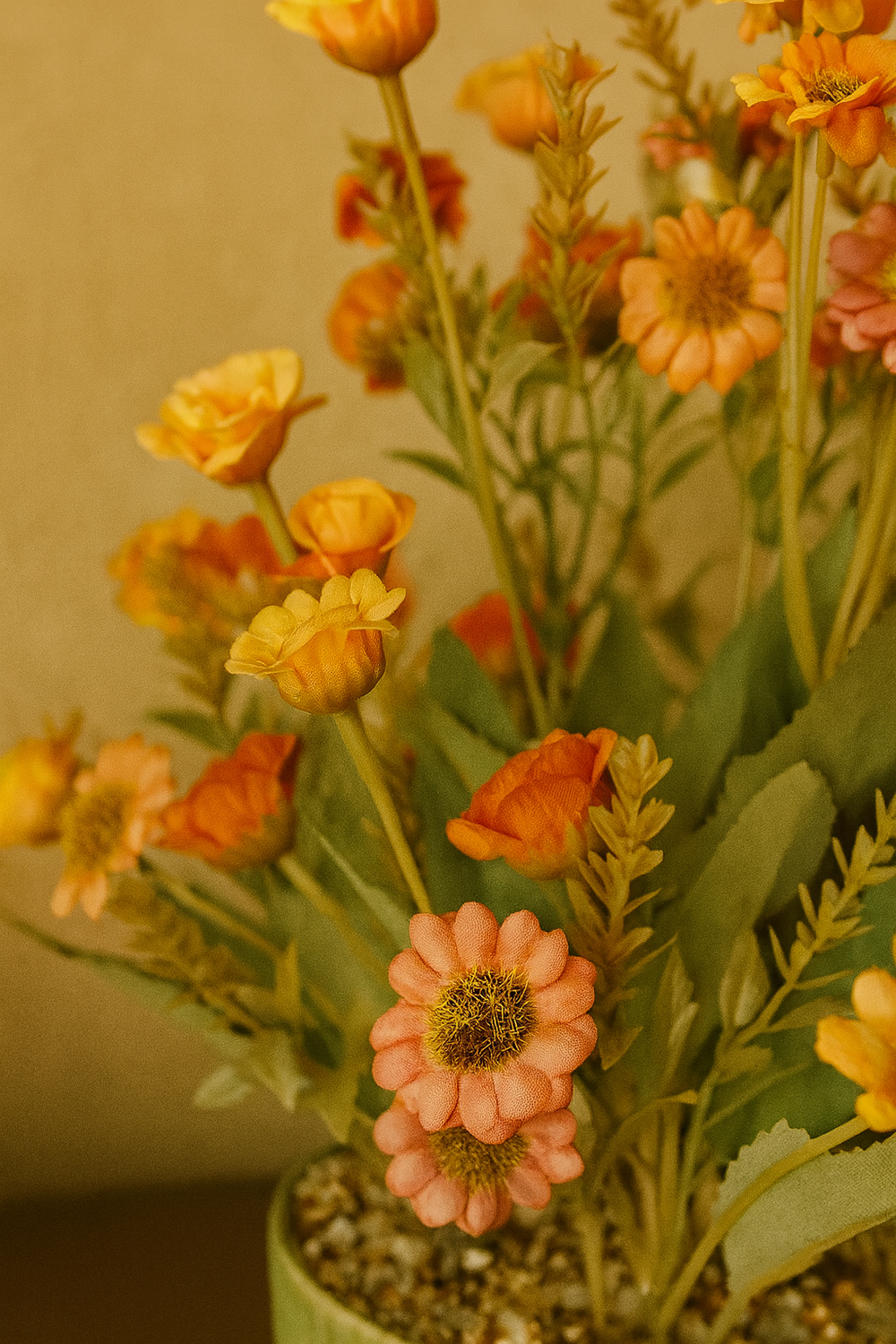 Vibrant, Lifelike Display: Bring a burst of year-round color to your home with this stunning Artificial Mixed Flower Bouquet. It features a lush mix of faux roses, daisies, and small filler flowers in rich, warm hues of sunset orange, peach, yellow, and subtle rust, designed to look fresh every day.