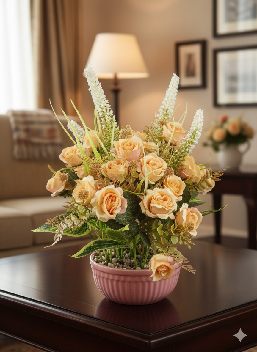Charming Round Ribbed Pot: The floral display is expertly set in a sweet, round pink ceramic-look pot with elegant vertical ribbing. This soft pink hue beautifully complements the warm tones of the roses, adding a touch of romance and serenity.