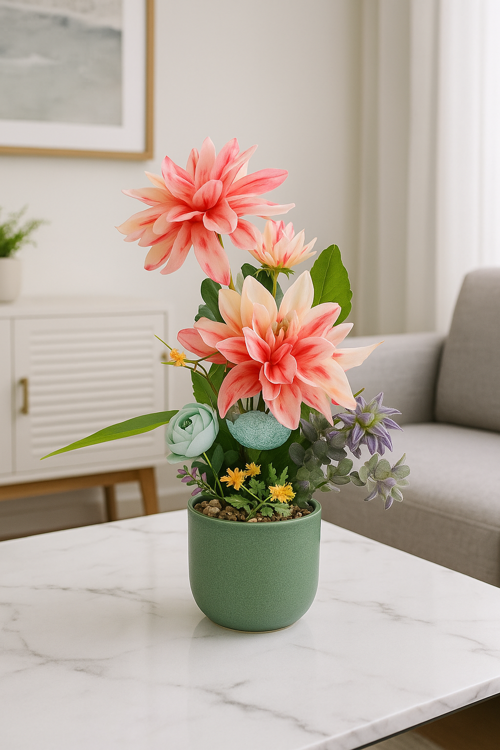 Bring timeless elegance to your home with this beautifully crafted artificial flower arrangement. Featuring vibrant coral-pink dahlias paired with delicate pastel blooms and lush green foliage, this arrangement adds a refreshing touch of nature to any space. Housed in a premium textured green ceramic pot with decorative pebbles, it blends effortlessly into modern living rooms, guest areas, offices, or tabletops.