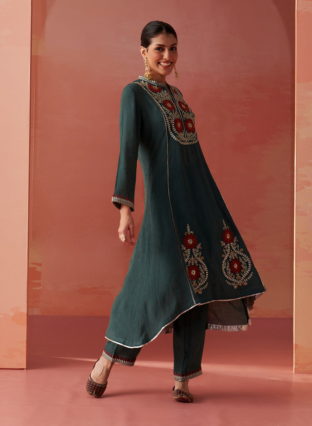•The relaxed, flared kurta showcases a mandarin collar and full sleeves, flowing elegantly with a high-low hemline.