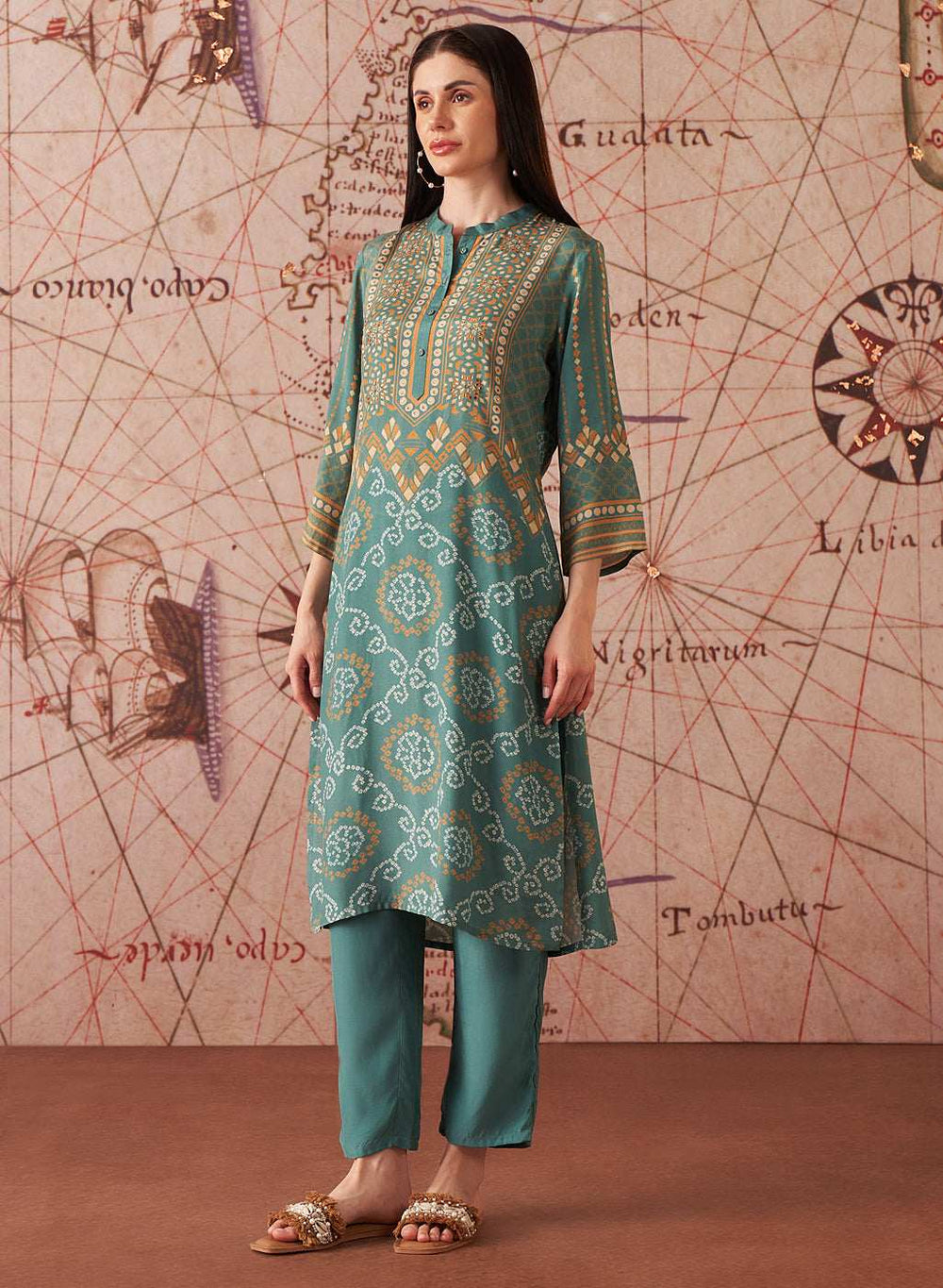 The Aashna kurta set in viscose shantoon captures the essence of understated luxury. Crafted from a lightweight, breathable fabric with a soft sheen, it promises comfort and style. The all-over print adds a layer of visual interest. The rhinestone embellishments on the mandarin collar further elevate the piece.