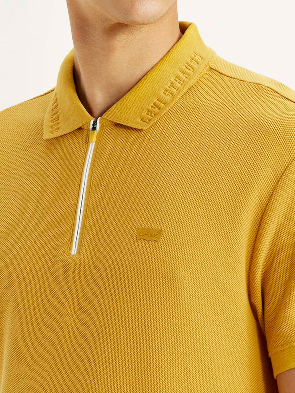Blending style with comfort, check out this off-duty essential by Levi's. This t-shirt features a solid pattern and comes in the color yellow. Classic polo collar neck and short sleeves.