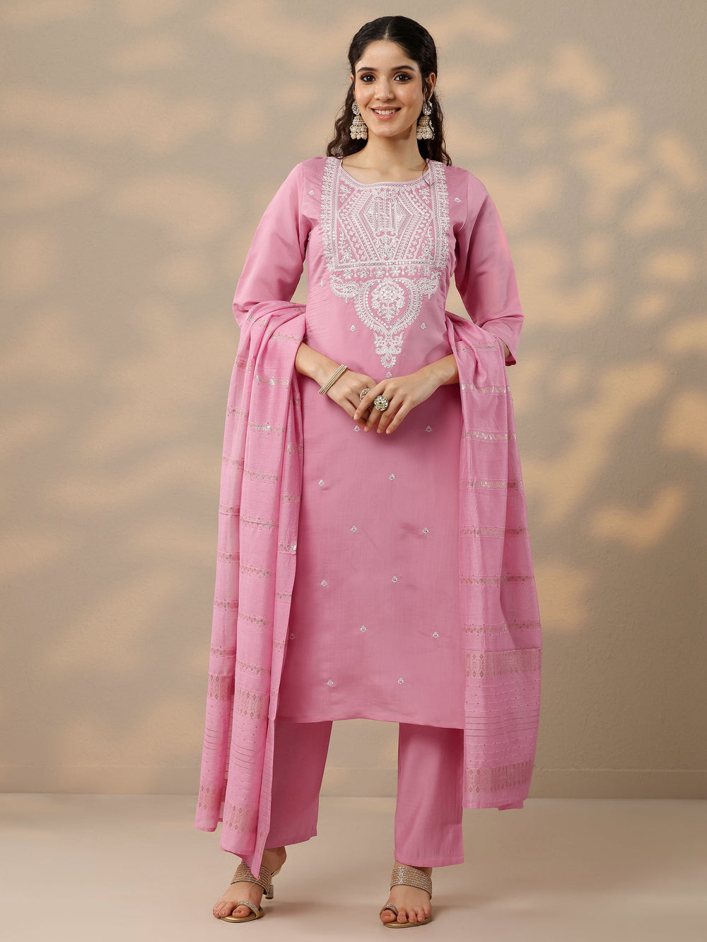 Our 3-piece Pink Silk blend Straight-fit Kurta Set features a Round Neckline, Regular Sleeves, and statement Yoke. Complemented with Straight Pants with a Partially Elasticated waistband and 2 pockets, and an Embroidered dupatta. Adorned with Embroidered accents, this style is perfect for Festive occasions.