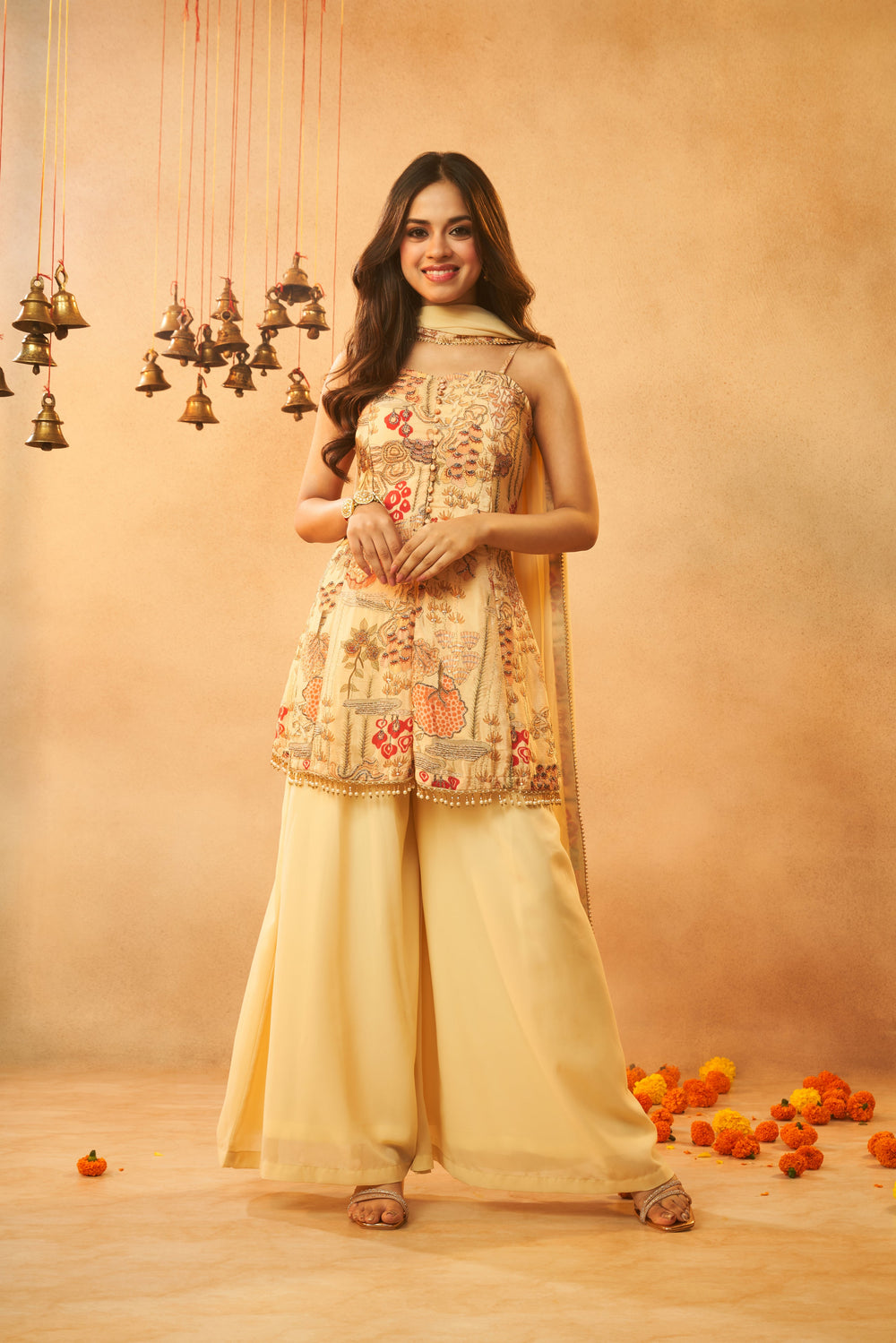 Embrace elegance with this cream skirt, kurta, and dupatta set from Raisin's Capsule Collection, featuring Nitanshi Goel. The kurta boasts a viscose muslin digital print, paired with georgette pants and dupatta, creating a soft yet striking look. Perfect for a festive celebration or party, this ensemble blends traditional grace with modern design, making it a must-have for your wardrobe.