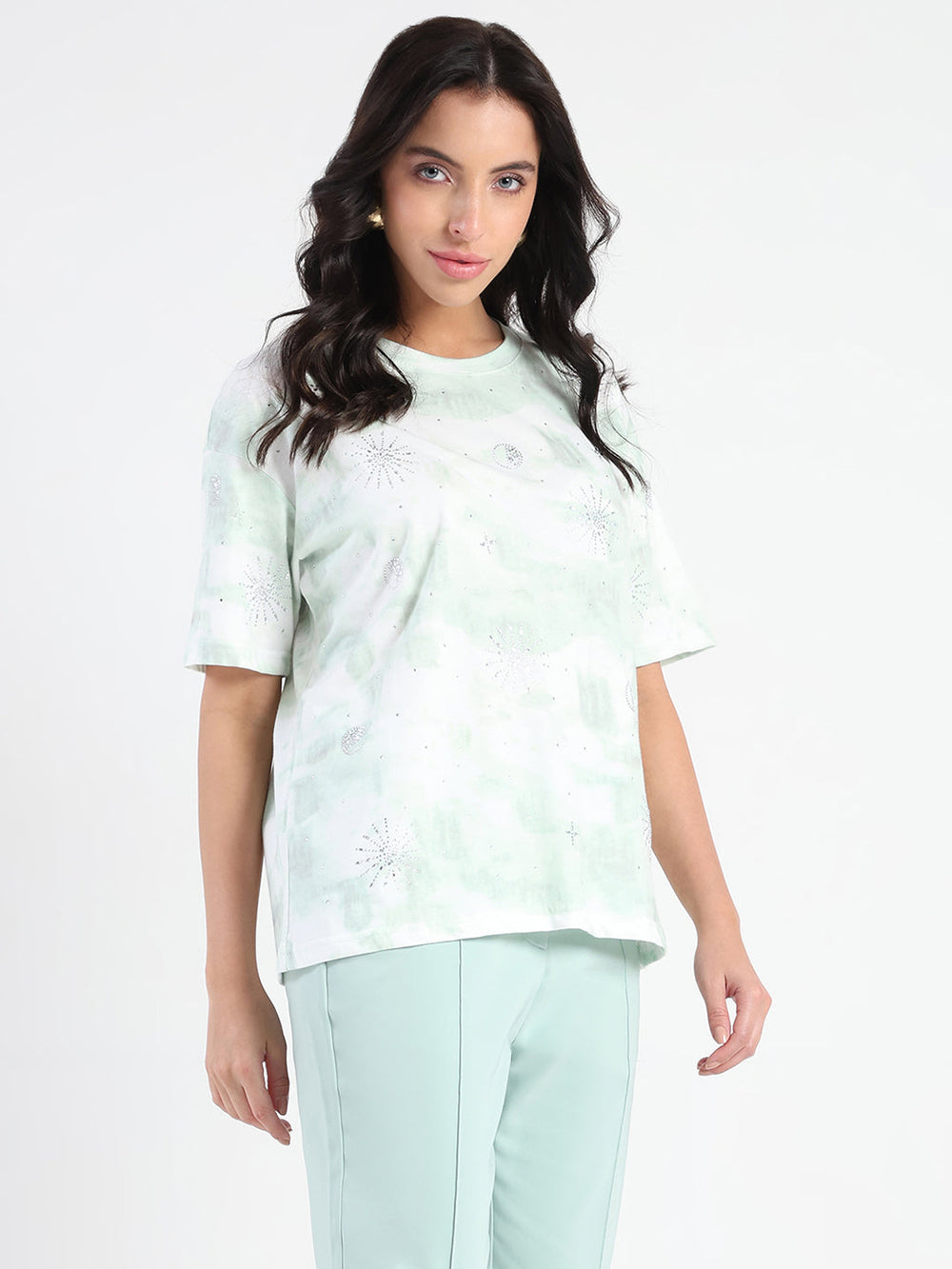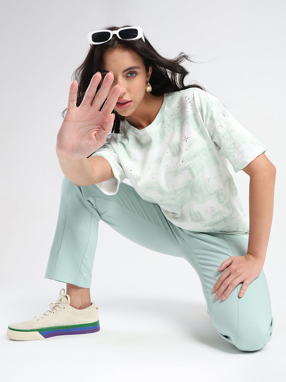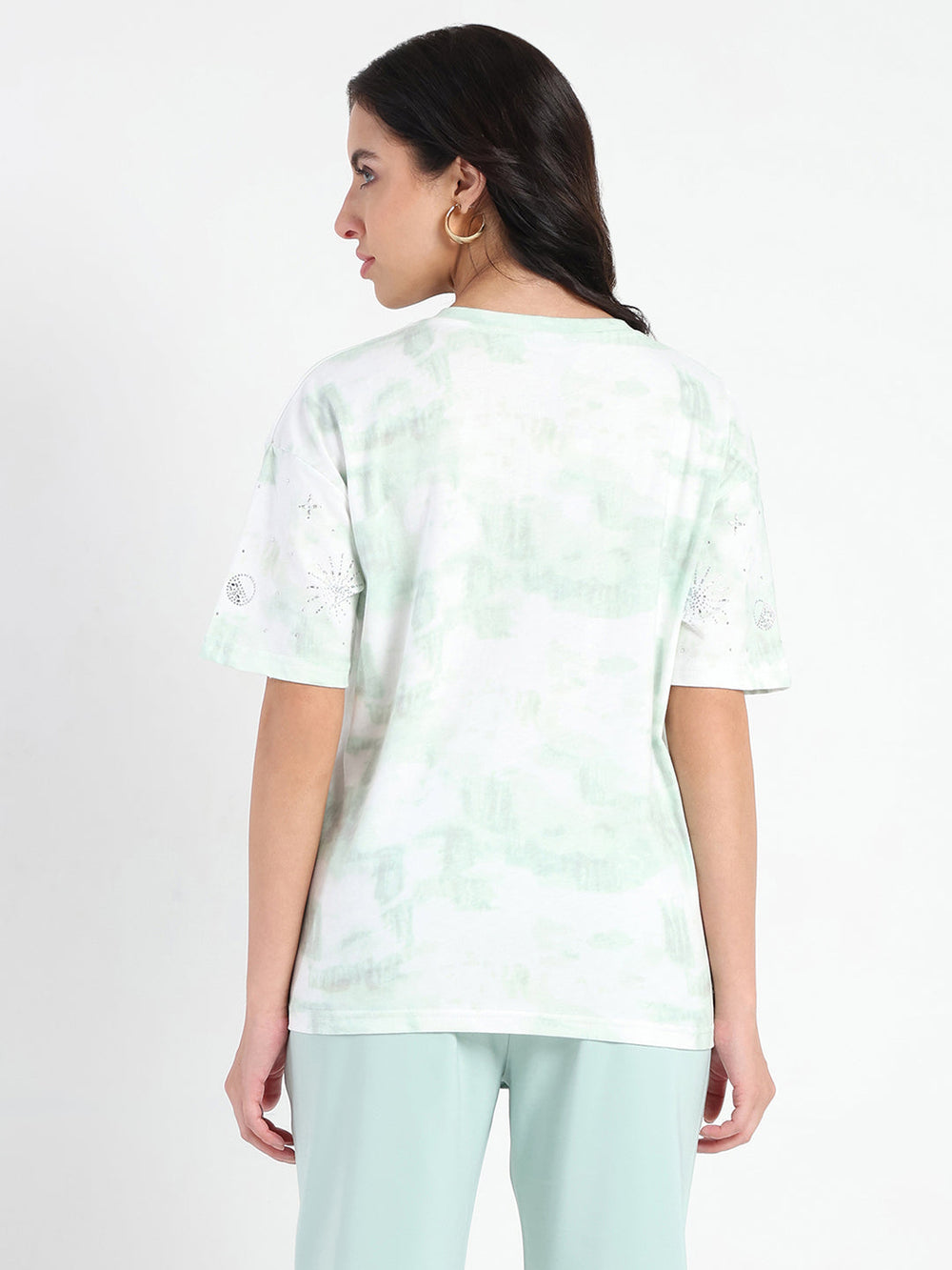 Make waves with this sea green tie-and-dye t-shirt, elevated by sparkling Swarovski details for a hint of glamour and a unique pattern for that laid-back vibe.