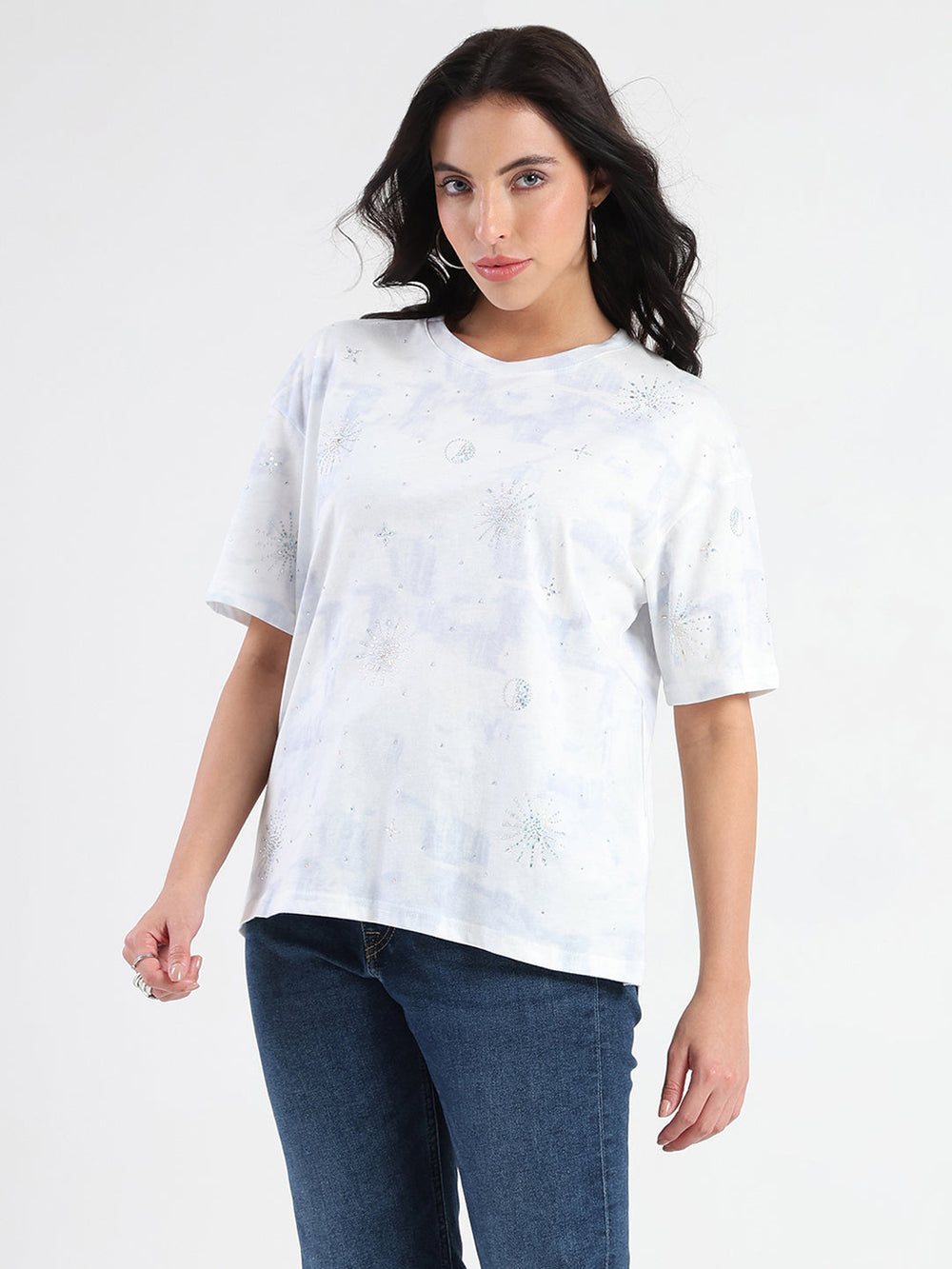 This sky blue t-shirt is where style meets glamour, adorned with Swarovski detailing, it adds an unexpected sparkle to the vibrant, swirling colors.