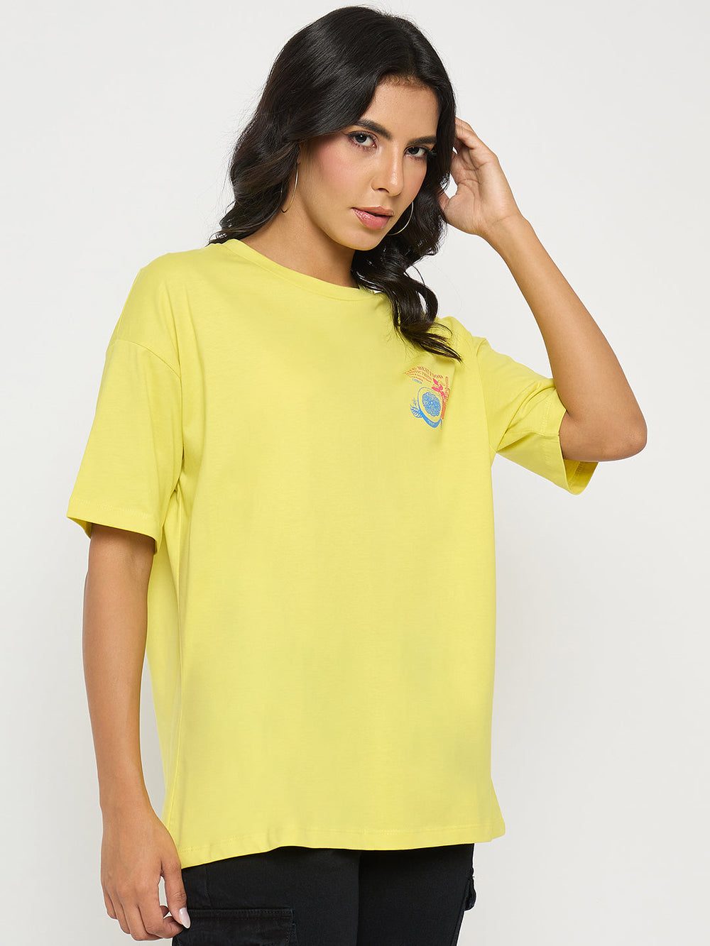Double the impact with front and back graphic prints on this vibrant yellow tee. A fun pick for casual hangouts or weekends, pair with denim for a bold vibe.