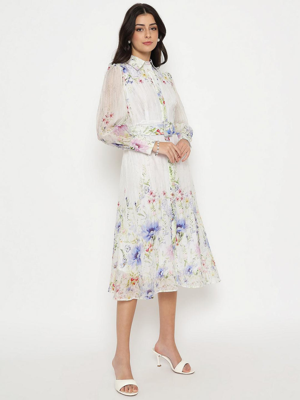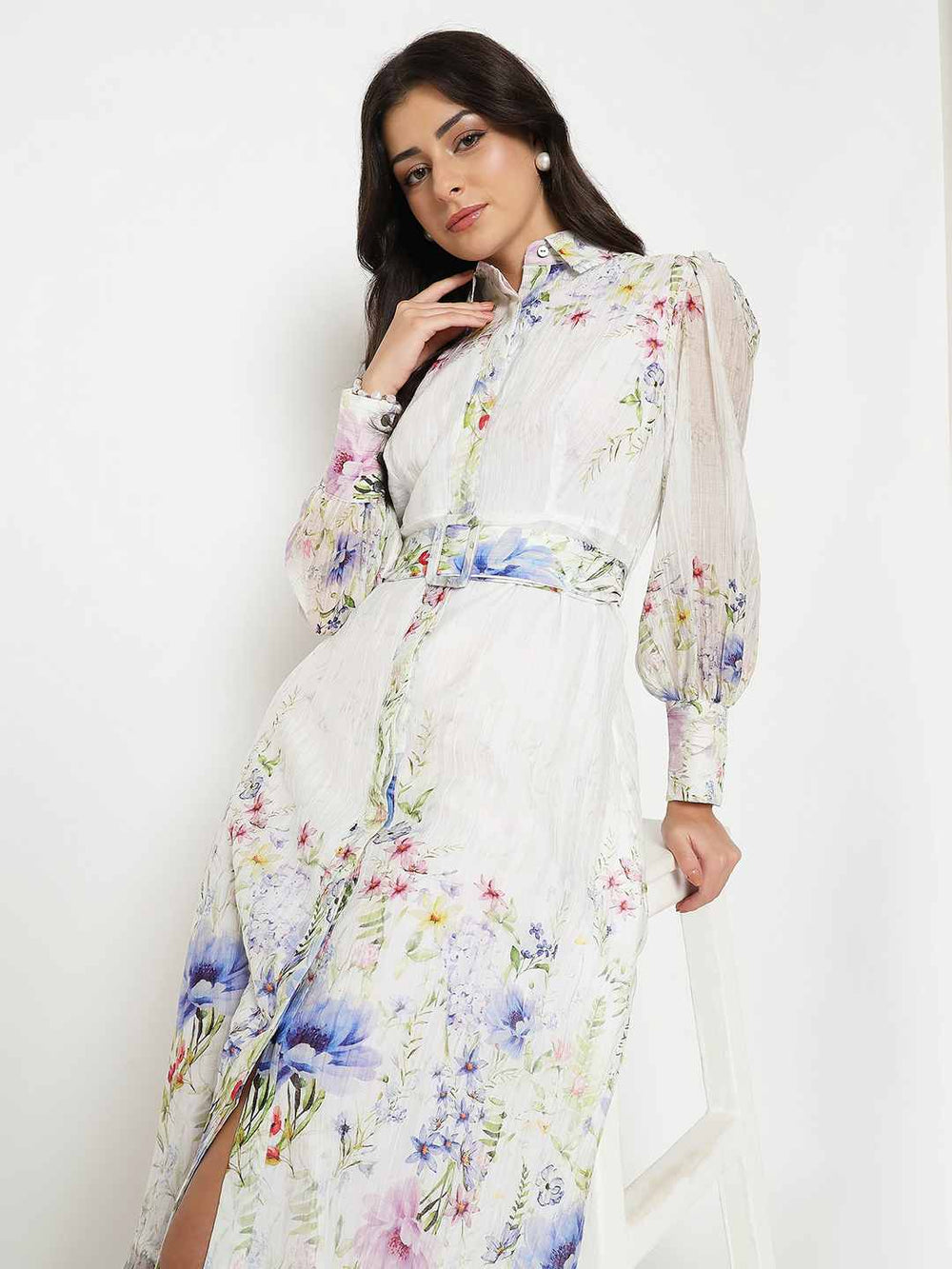 This white shirt dress features a graceful floral print and a cool belted waist for added shape. Breezy and elegant, perfect for garden parties or brunches.