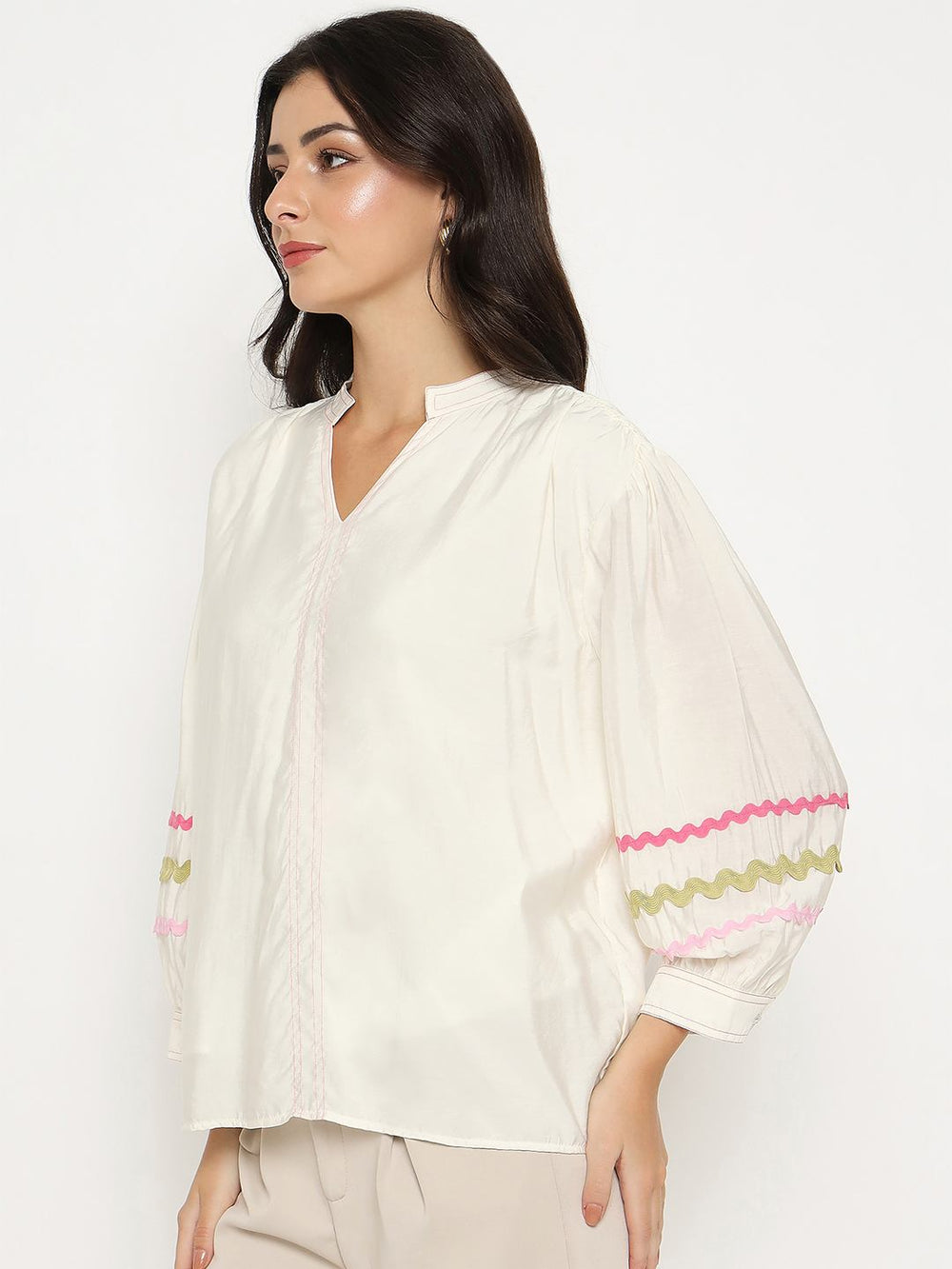 This off-white top features delicate Dori embroidery on a soft rayon blend, blending artisanal charm with everyday comfort. Perfect for brunches or workdays.