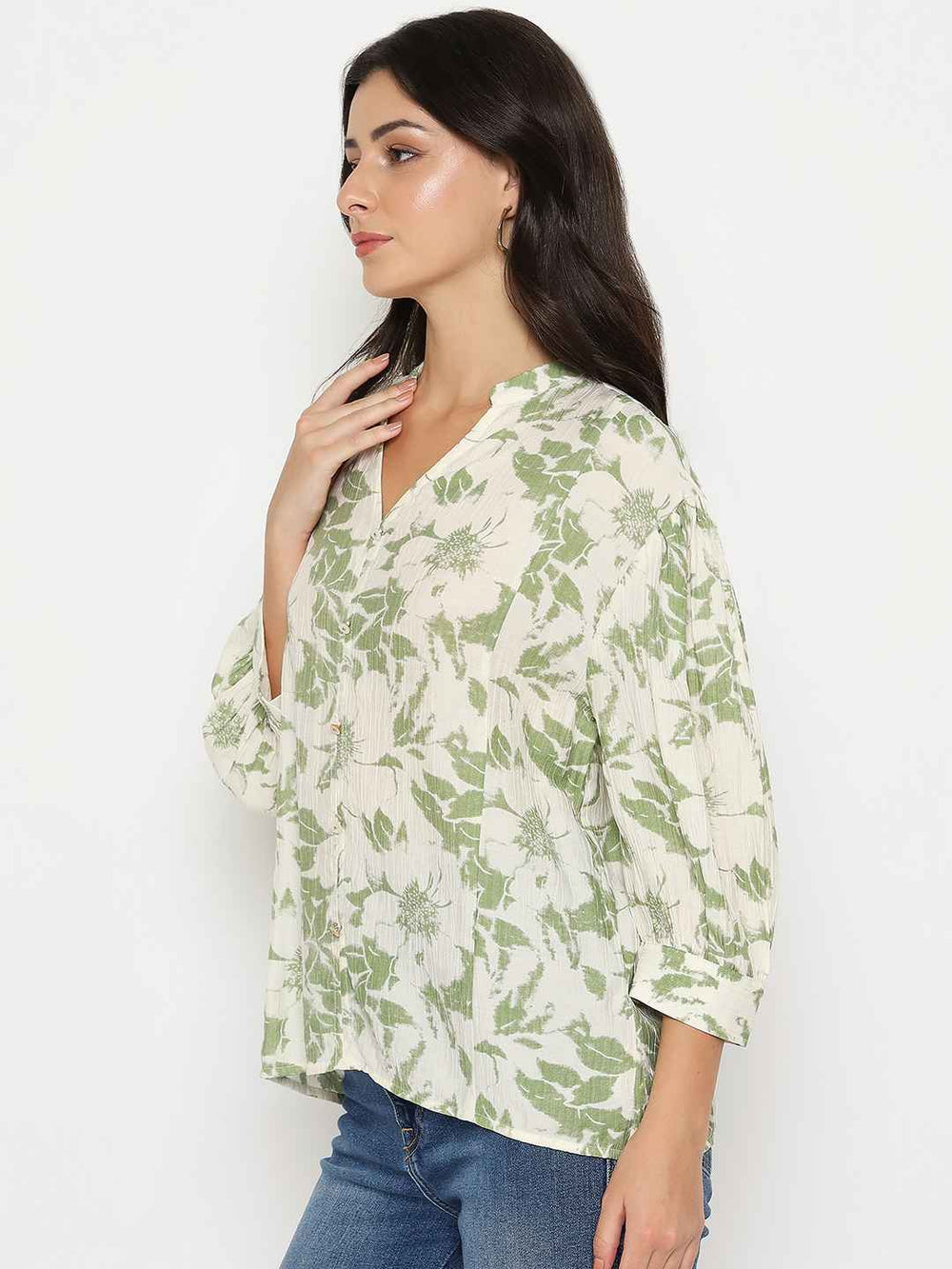 This coral top features a lively print on a soft rayon blend, offering comfort with nature-inspired charm. Ideal for casual outings, pair with white trousers.