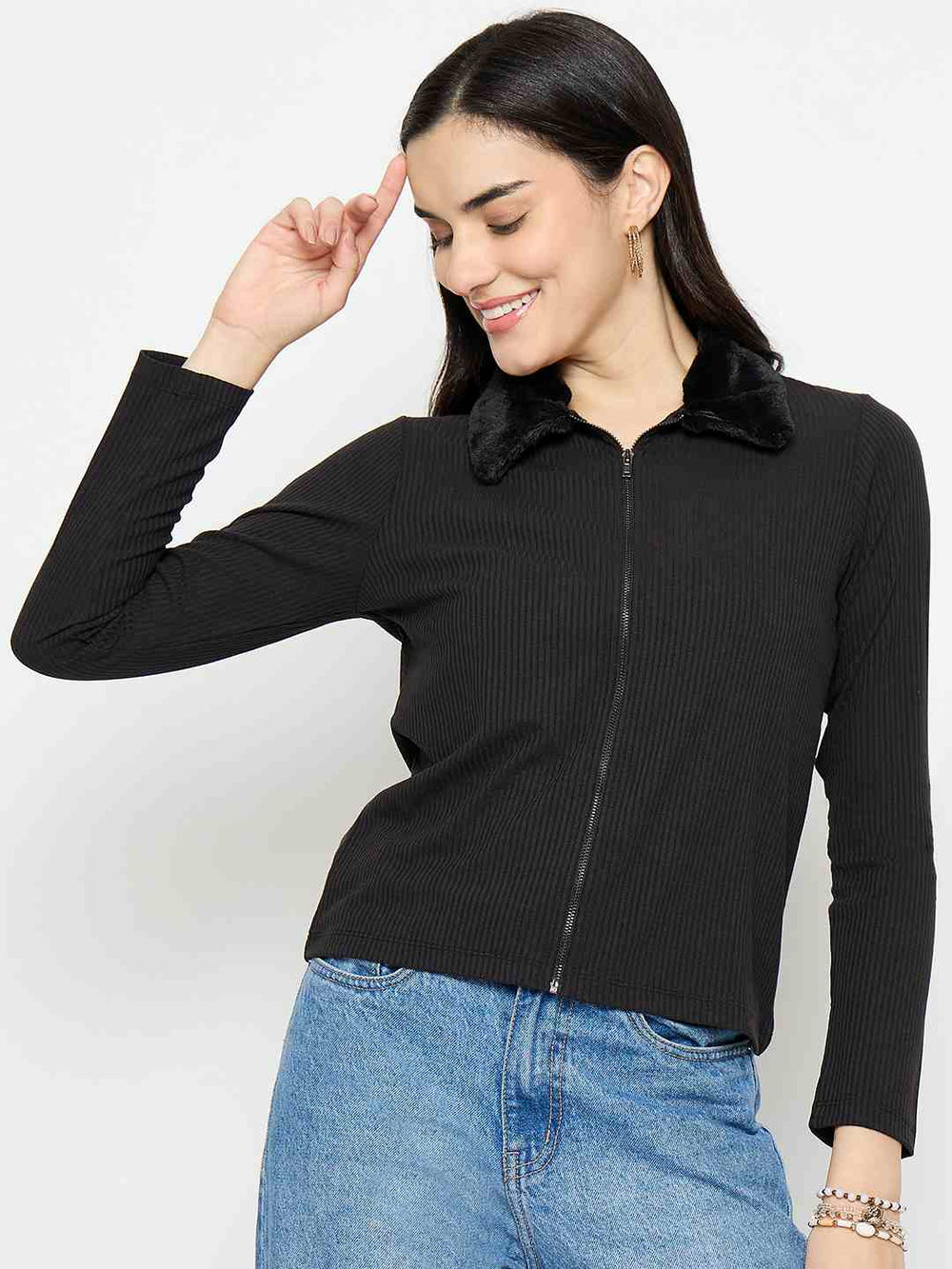 This black top is detailed with luxe faux fur trimming for a touch of glam. Equal parts cozy and chic, it's your winter-ready statement piece with a zip.