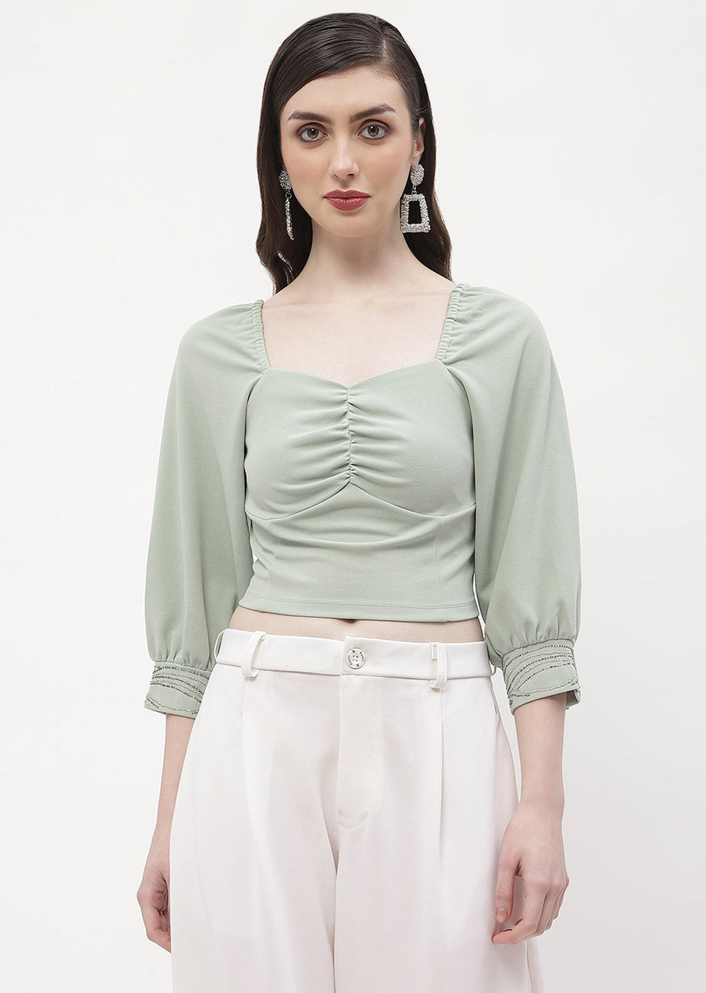 The Sweetheart Neck Sage green Embellished Cuffs Top is here to make a grand entrance into your closet. This charming top exudes sophistication with its delicately embroidered sleeves and figure-flattering sweetheart neckline. Perfect for both dressy occasions and day-to-day adventures, the timeless sage green hue guarantees adaptability. Take your style to the next level with this classic accessory that will never go out of style.