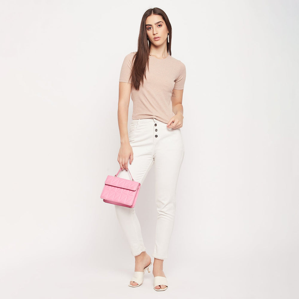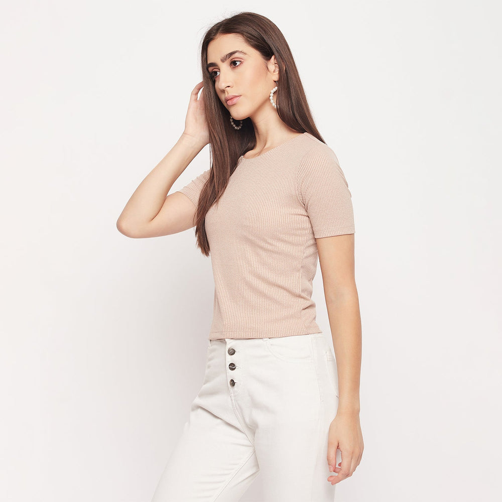 Breeze through the scorching summer heat in the style and comfort of this beige cotton top. Designed with a ritzy keyhole detailing on the side of its round neckline which is accented with fitted half sleeves, this top is an elegant piece for summer soirée. It would look great when paired with black flared trousers and heels.