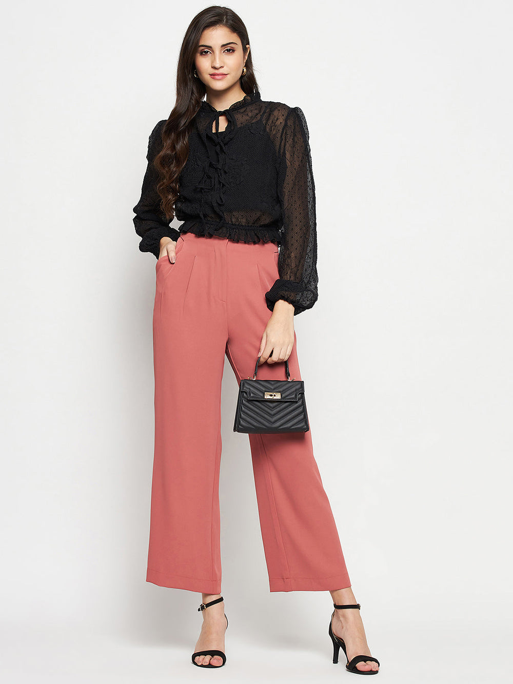 This black peplum top is designed with a delicate and subtle dotted texture with structured peplum flare, adding a refined touch to casual and dressy outfits.