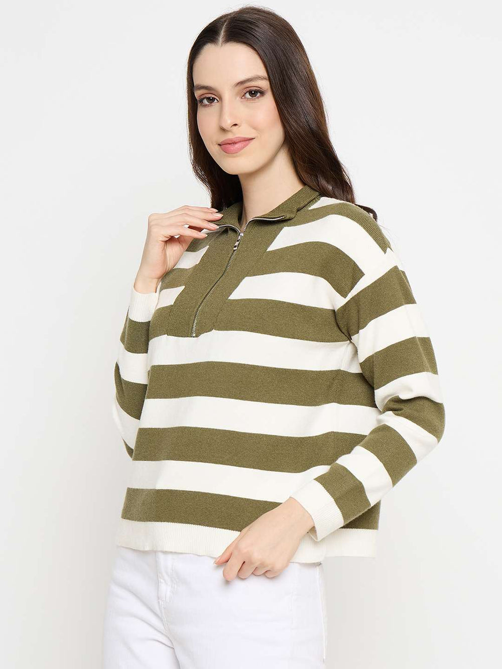 This olive green sweater showcases the soft classic stripes and a handy zip-up front that combines functionality with fashion. Perfect for layering over tees or pairing with casual bottoms, itâs both a polished yet casual touch to any outfit.