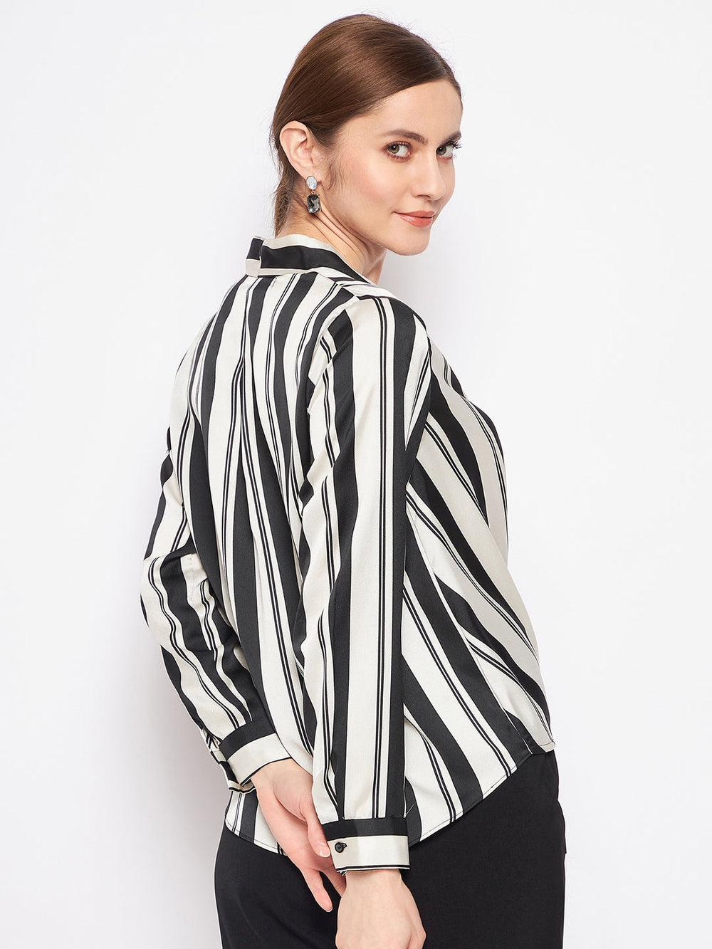 Madame Striped Black Shirt oozes sophistication with its chic stripes and feminine surplice neckline.
